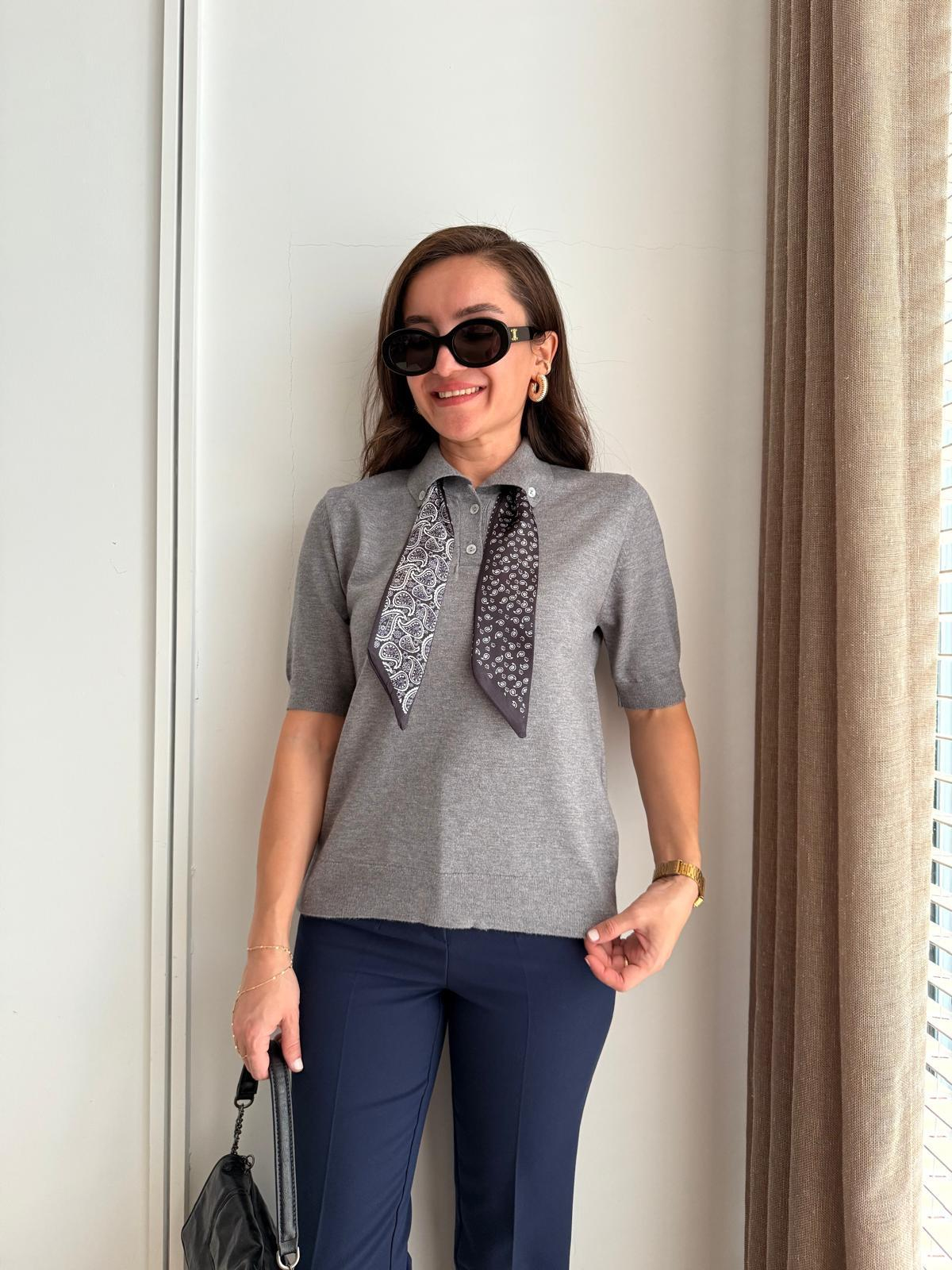 Antrasit Polo Yaka Fular Detaylı Kısa Kol Triko Bluz 140502