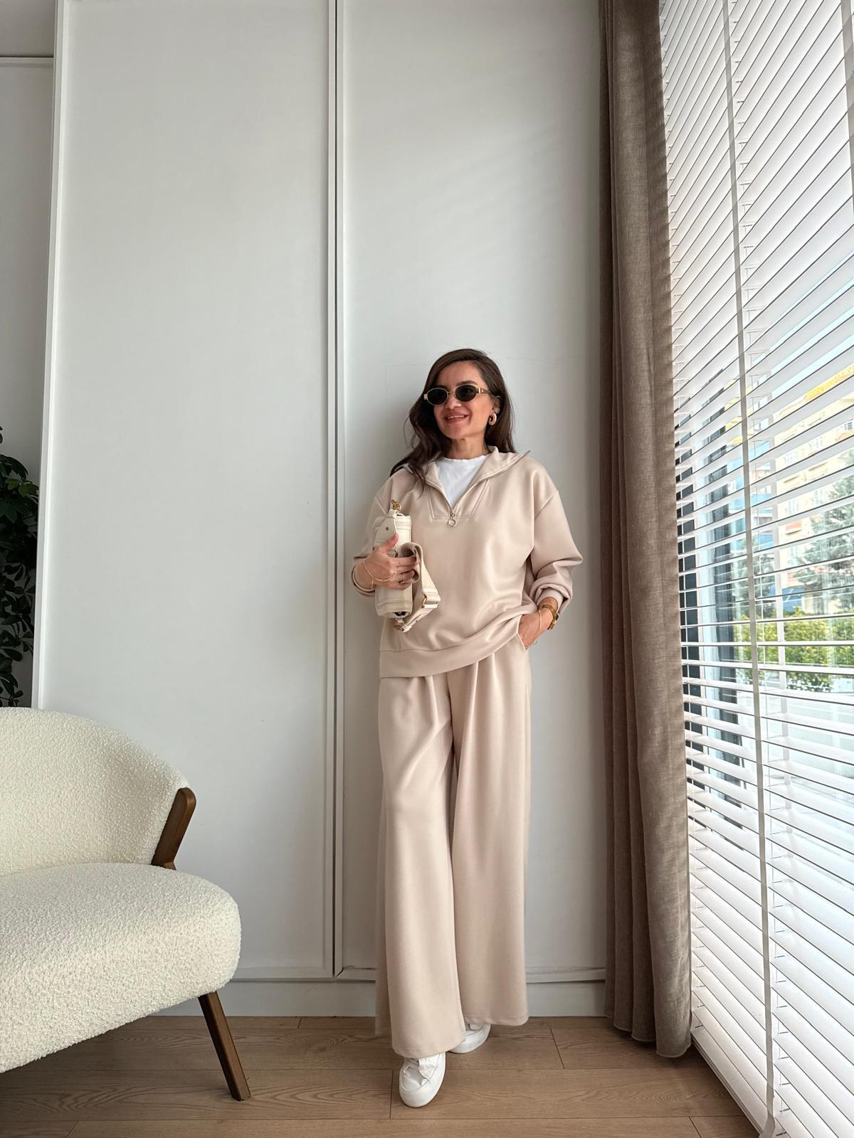 Bej Dik Yaka Fermuarlı Modal Takım 1105