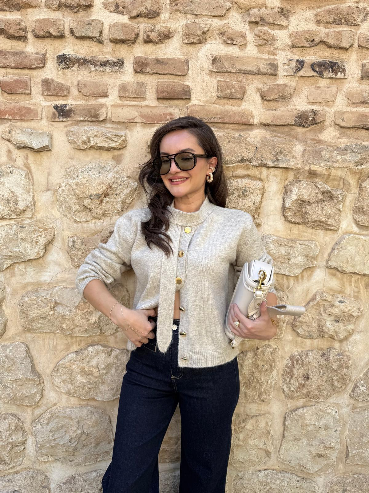 Bej Gold Düğmeli Bağlama Detaylı Triko Hırka 251040