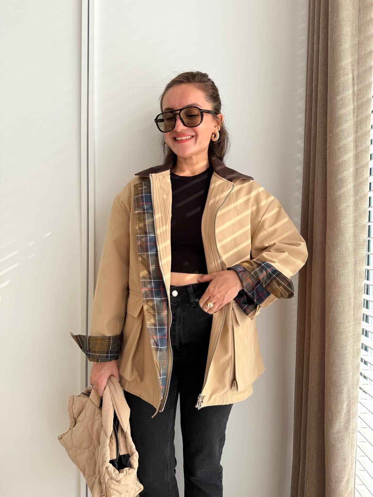 Bej Kadife Yakalı Ekose Astarlı Mont 7095
