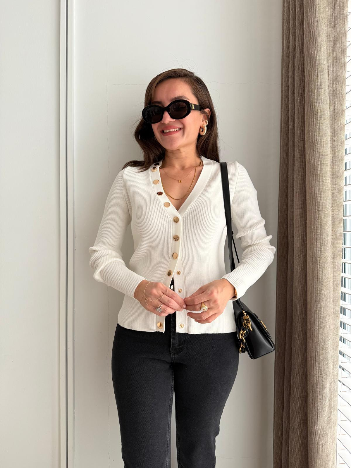 Beyaz Gold Çıtçıt Düğme Detaylı Fitilli Hırka 4944