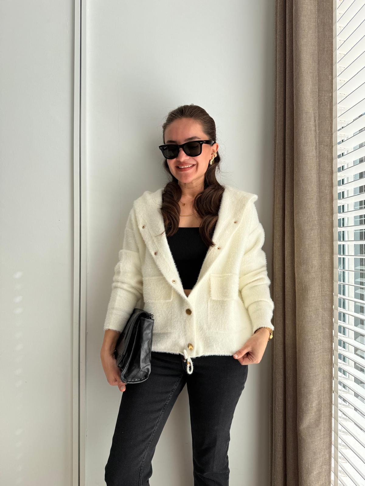 Beyaz Lüx Kalite Gold Düğmeli Kapüşonlu Triko Ceket 24400