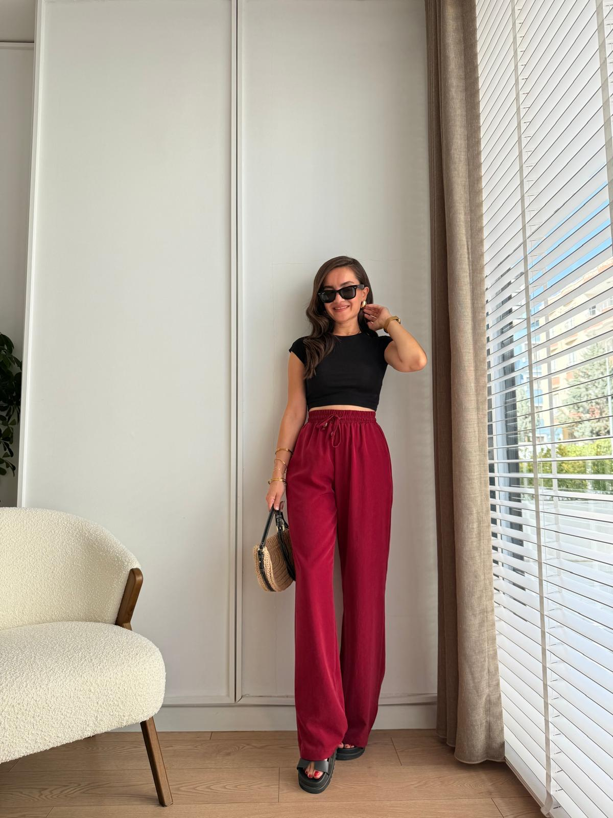 Bordo Bel Lastikli Tensel Palazzo Pantolon 3280