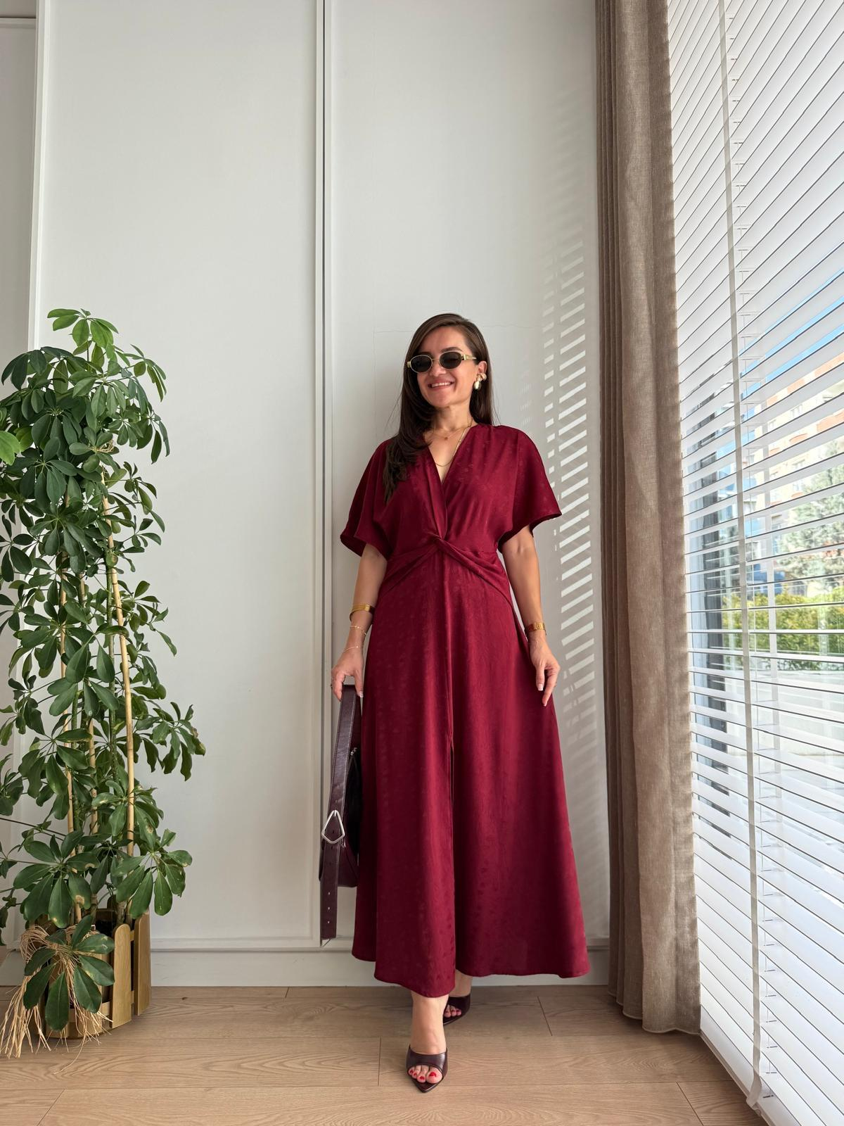 Bordo Düğüm Detaylı Desenli Jakar Elbise K251670