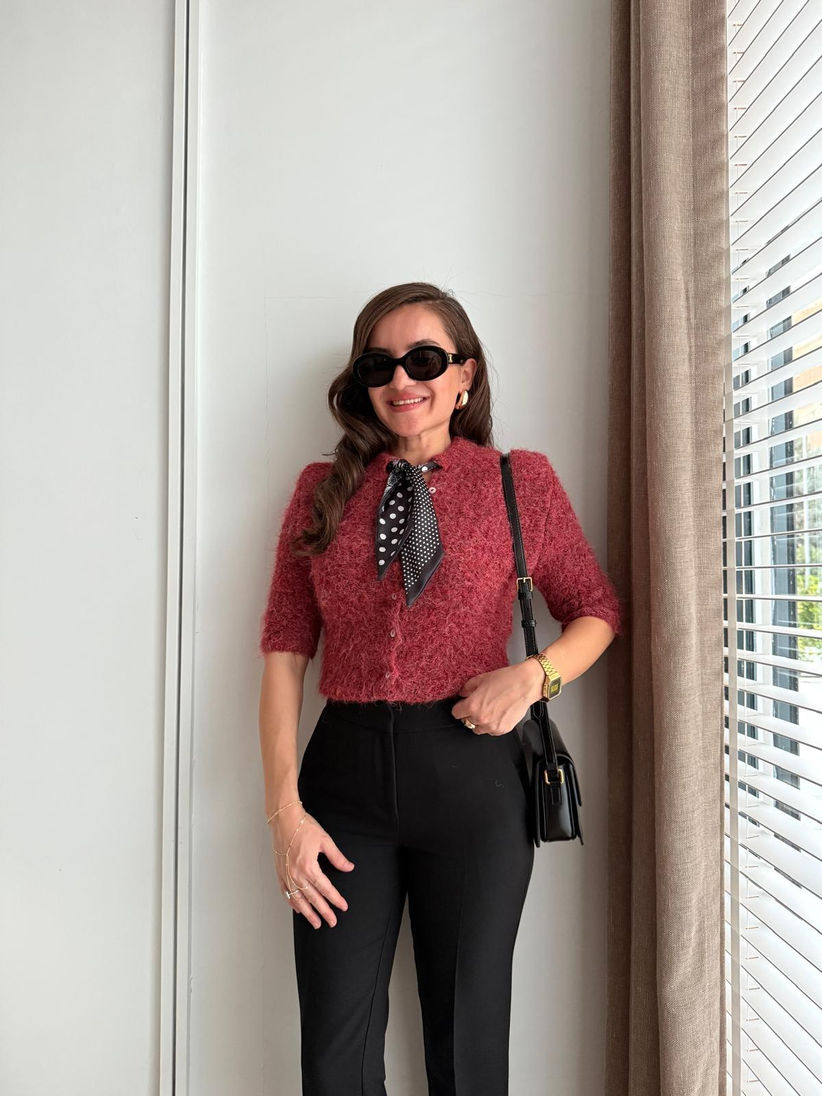 Bordo Fular Detaylı Kısa Kol Triko Hırka 3193