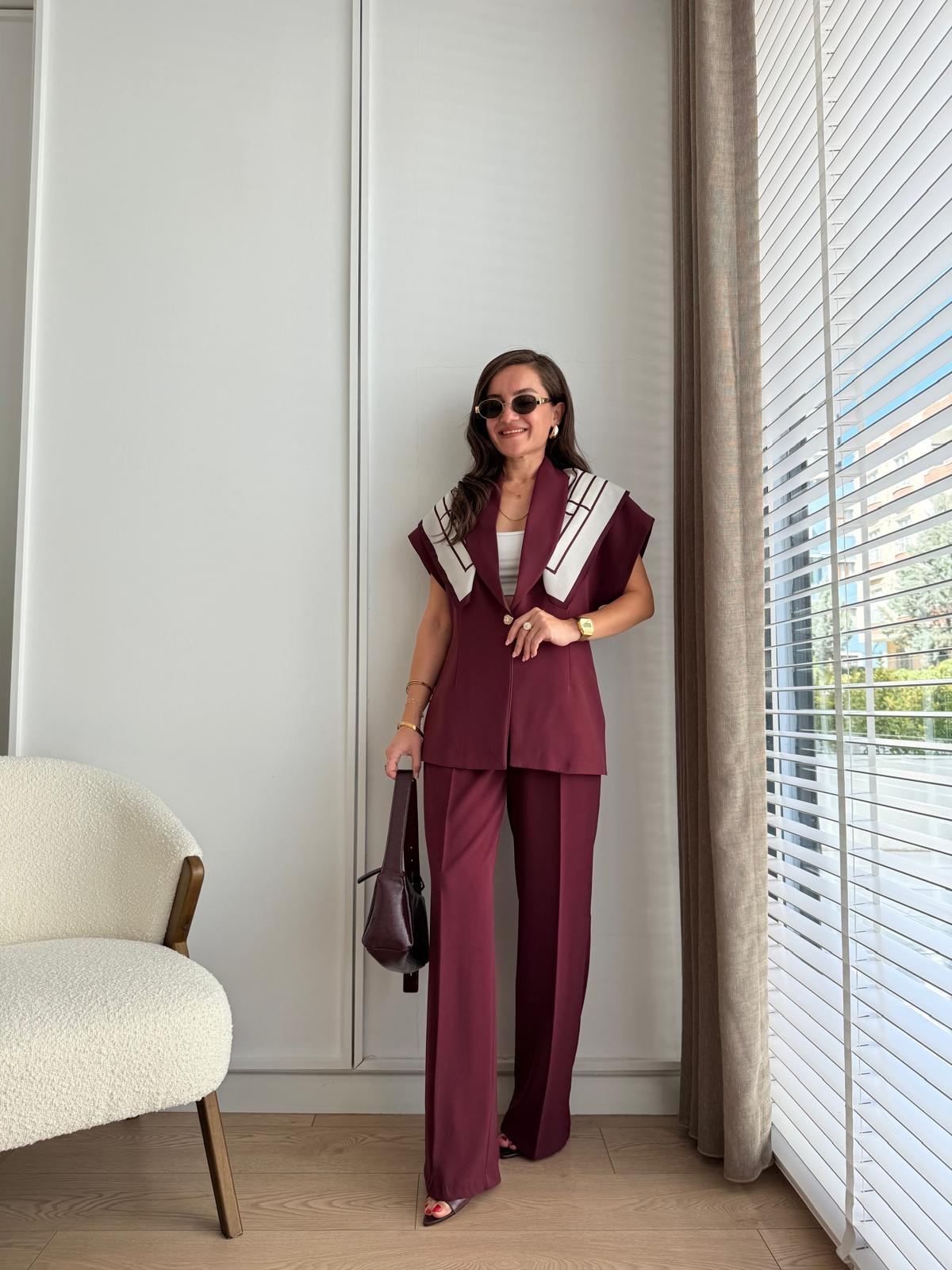 Bordo Kruvaze Yaka Gold Düğmeli Yelek Pantolon Takım 8789
