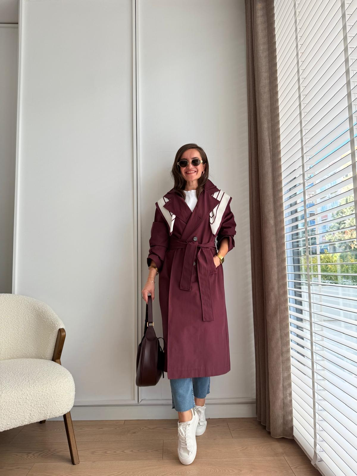 Bordo Lüx Kalite Fularlı Uzun Trençkot 7535