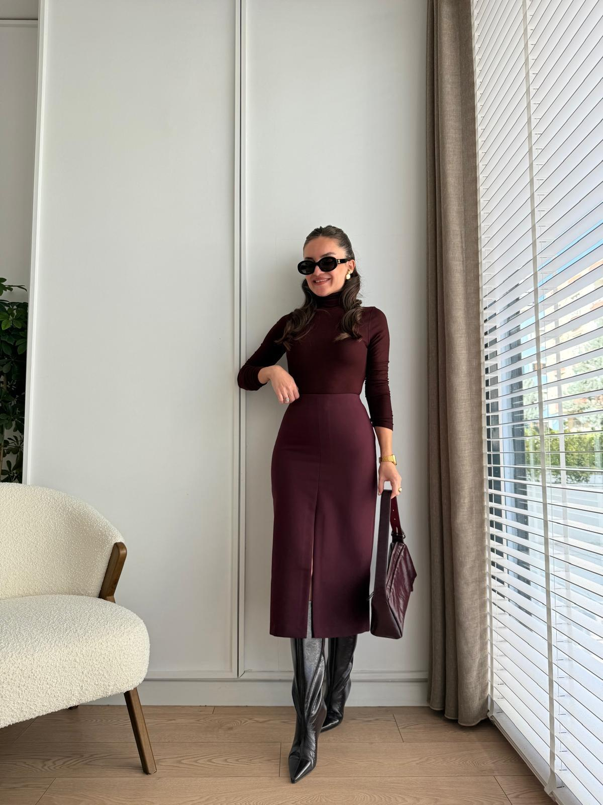 Bordo Önü Yırtmaç Detaylı Kalem Etek 4866