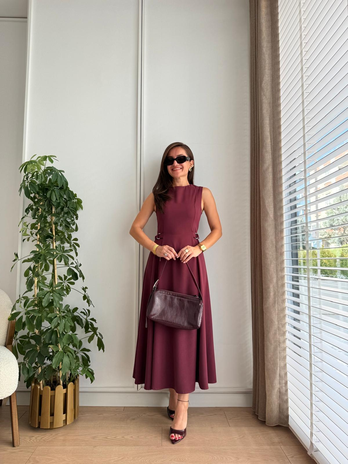 Bordo Sıfır Kol Kendinden Kemerli Kloş Elbise 2313