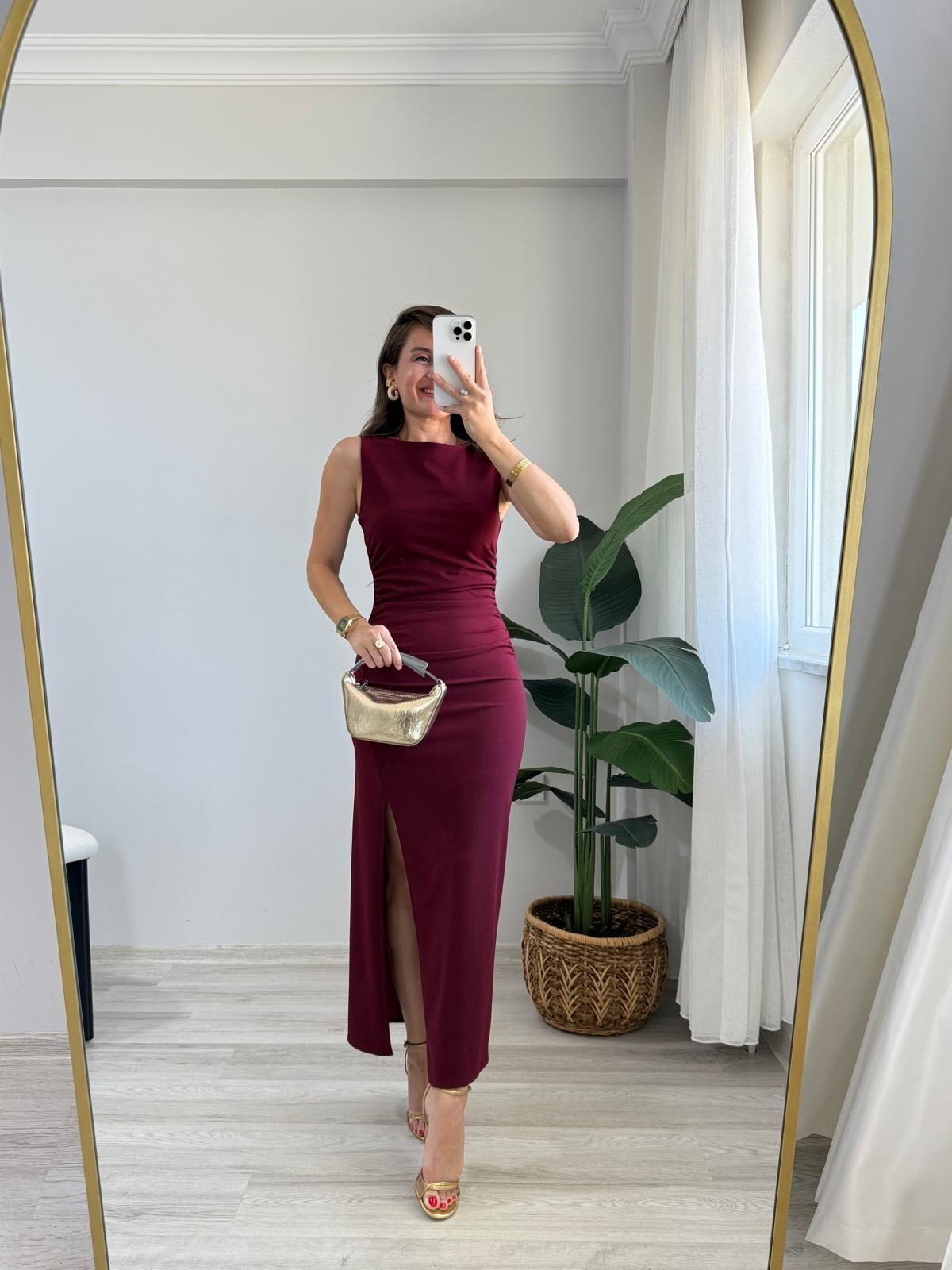Bordo Sıfır Kol Yan Drapeli Yırtmaçlı Elbise 314