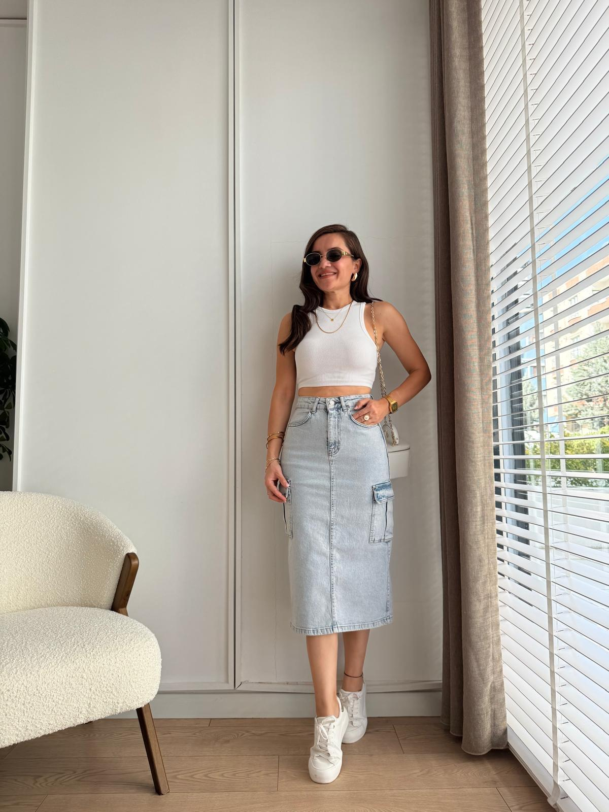 Buz mavisi Cepli Yırtmaçlı Denim Etek 1023