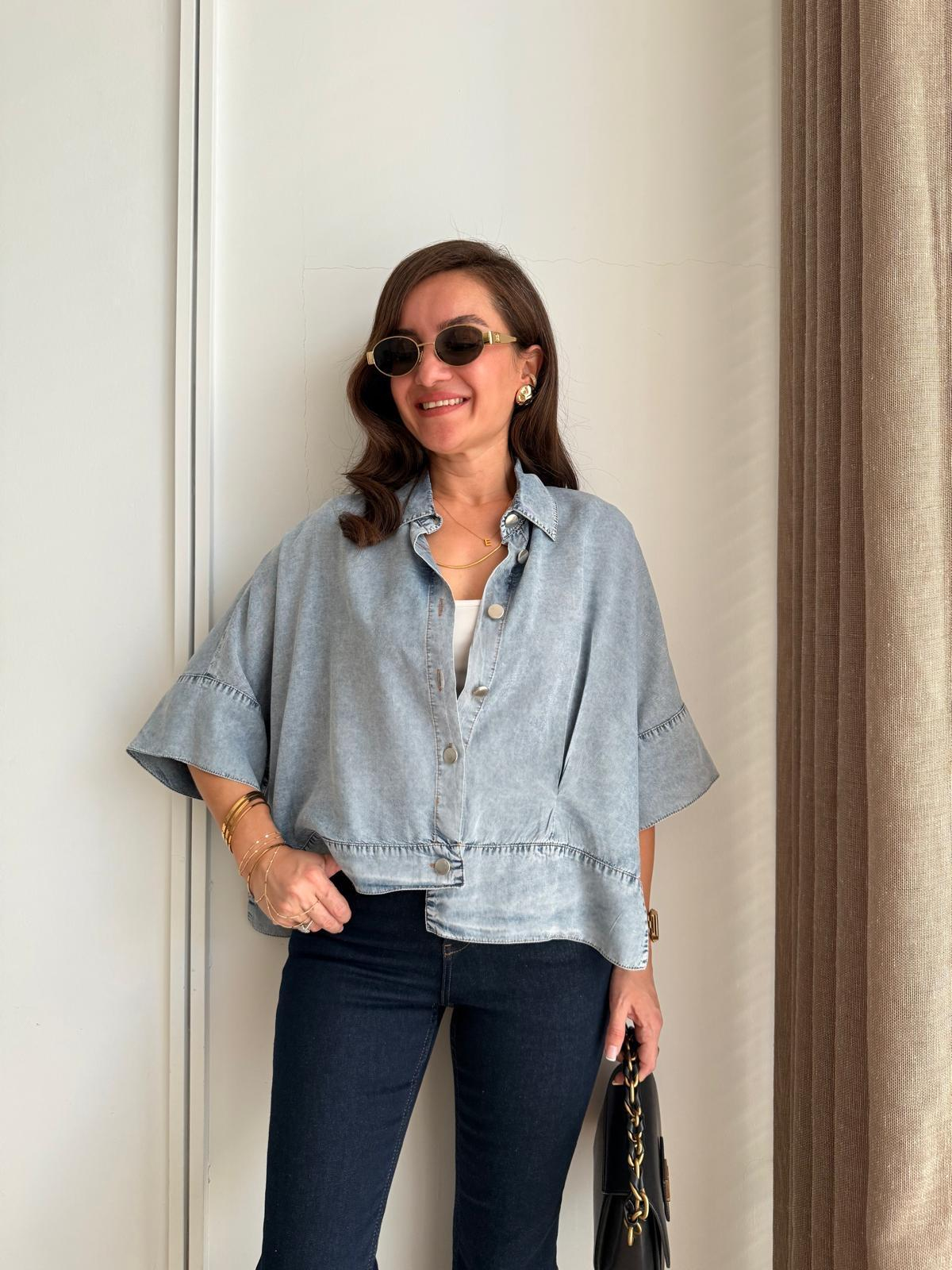 Buz mavisi Tasarım Tensel Kumaş Kot Gömlek 0095