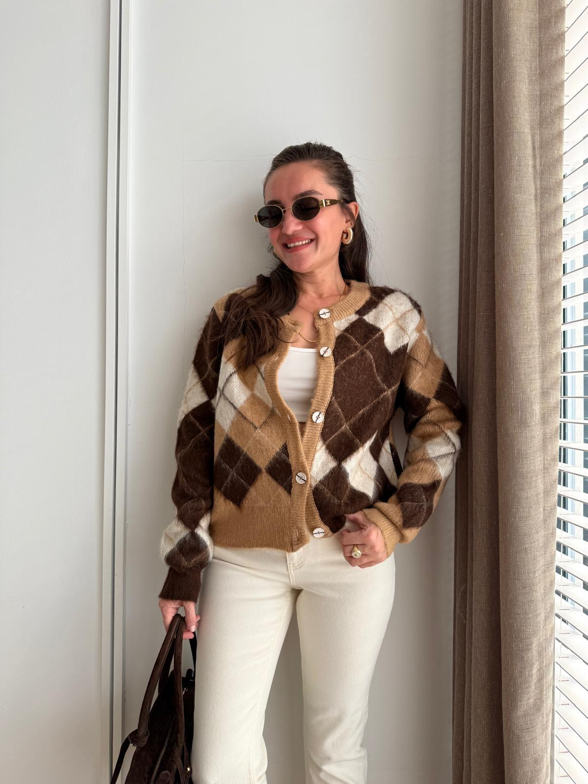 Camel Baklava Desenli Sakallı Triko Hırka 4922