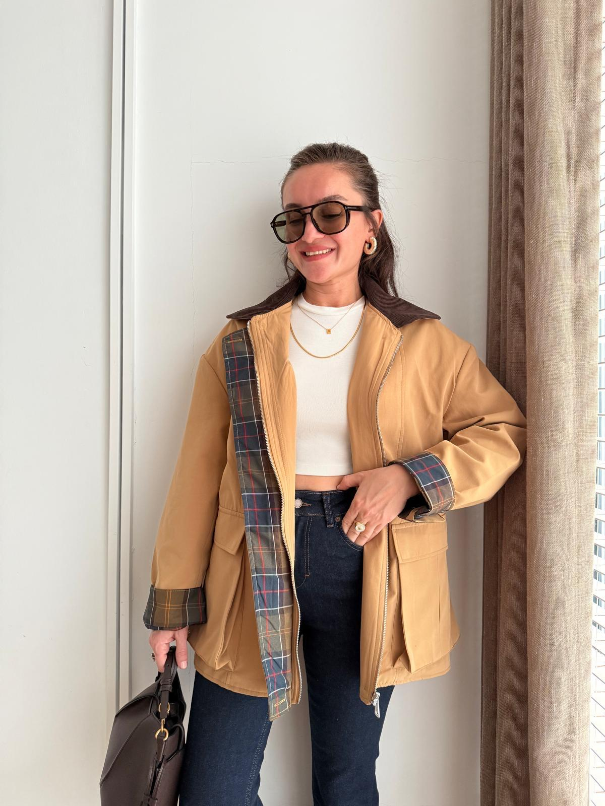 Camel Kadife Yakalı Ekose Astarlı Mont 7095