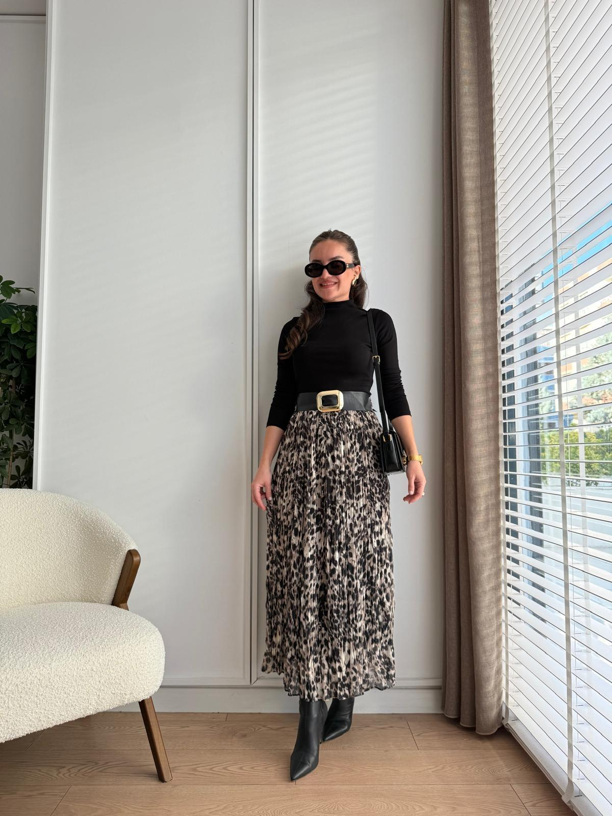 Camel Kemerli Leopar Desen Chruslı Etek 7683