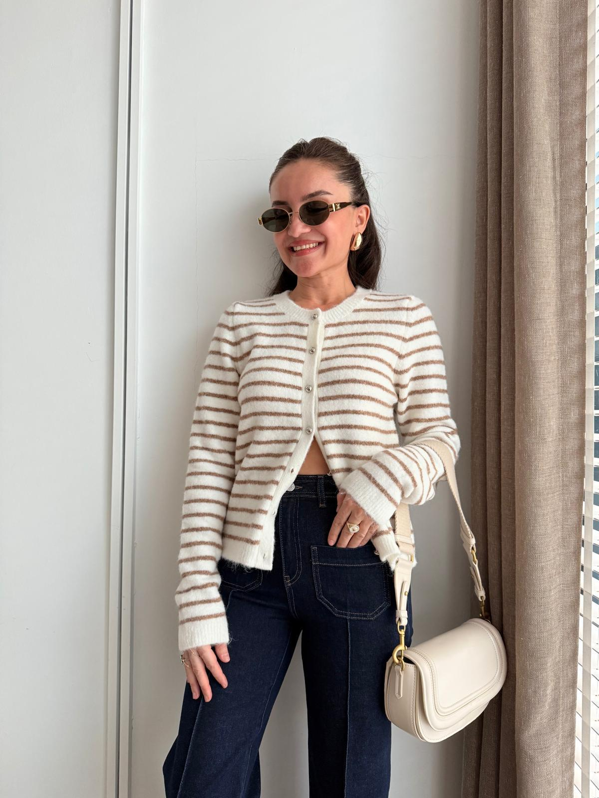 Ekru Gümüş Düğmeli Çizgili Triko Hırka 4870