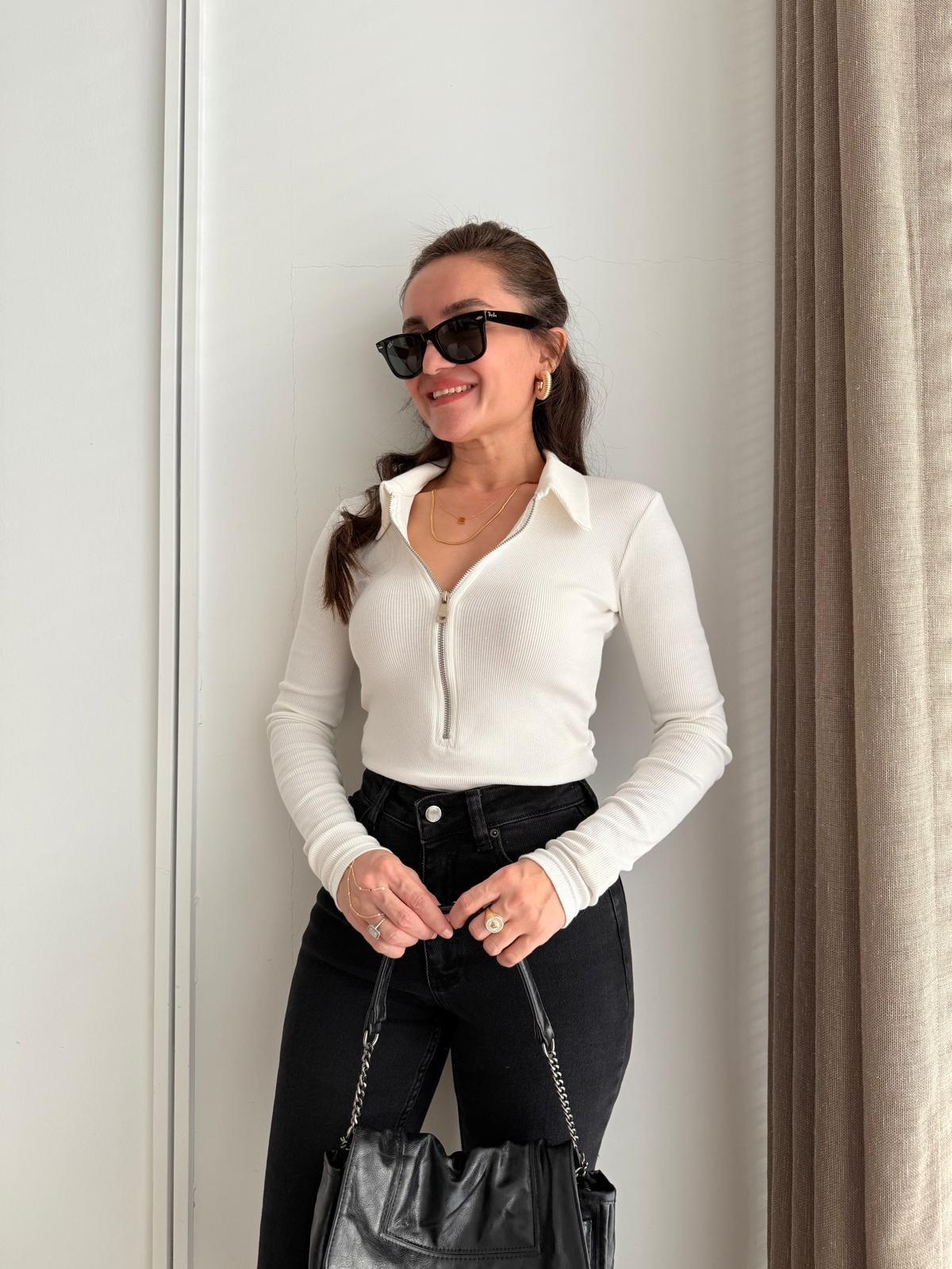 Ekru Polo Yaka Ön Fermuarlı Bluz 251016