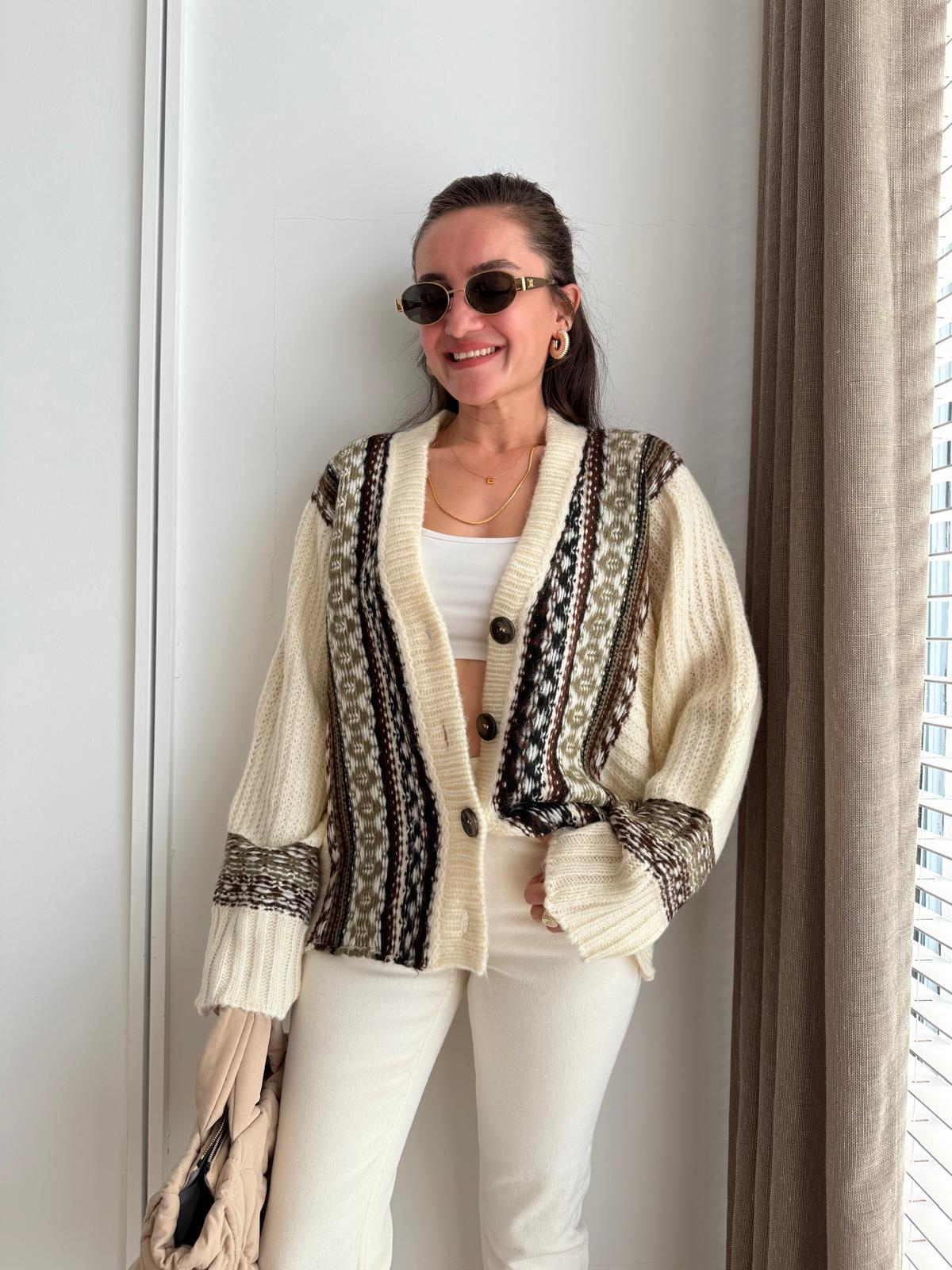 Ekru V Yaka Etnik Desenli Triko Hırka 5057