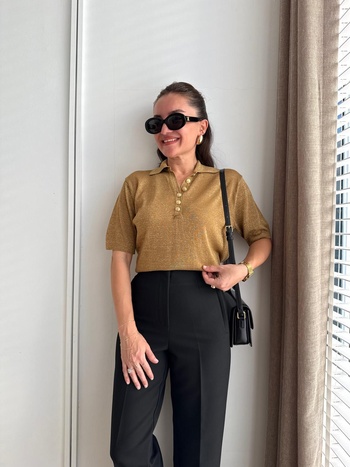 Gold Polo Yaka Gold Düğmeli Simli Bluz 251111