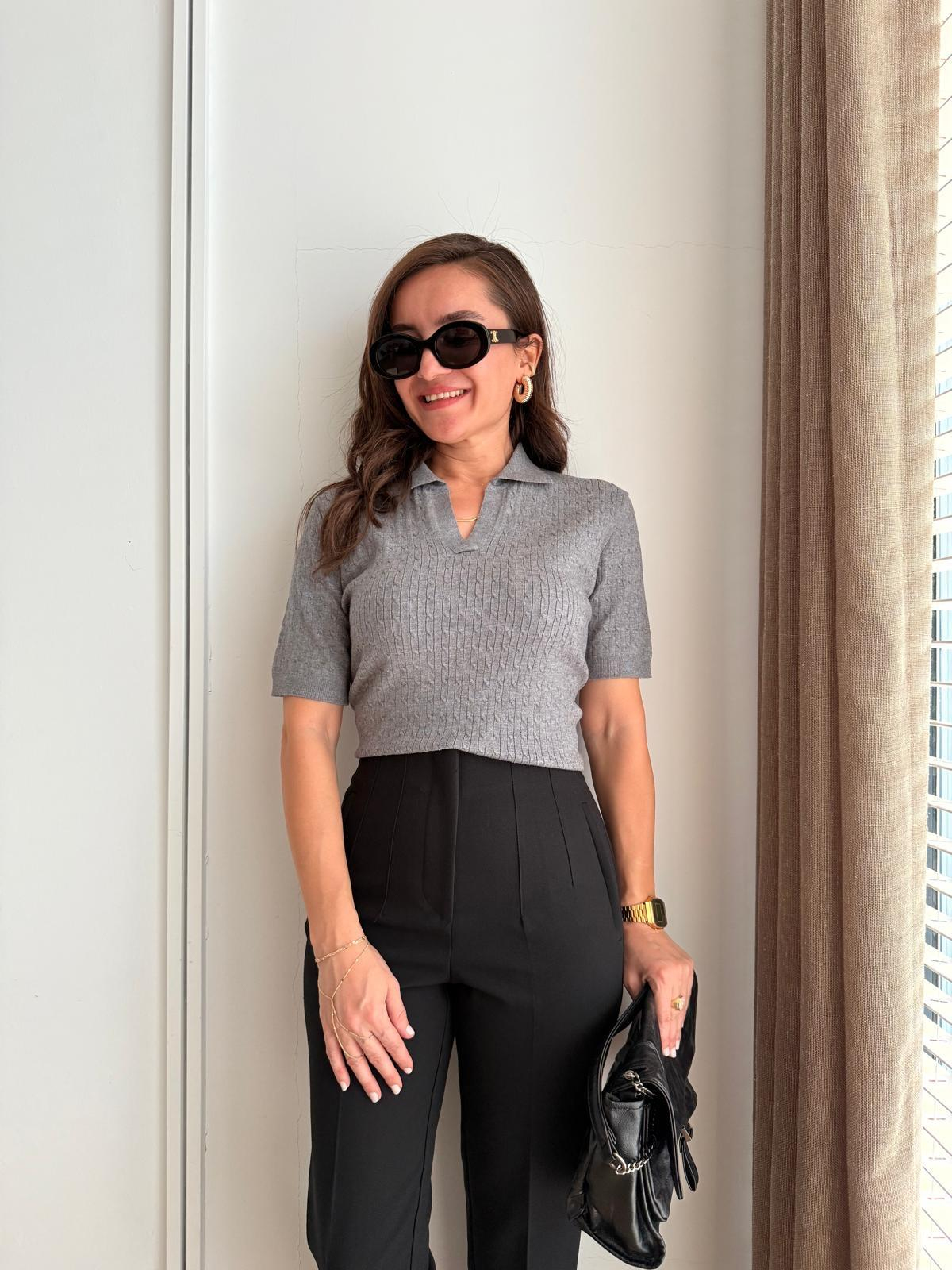 Gri Saç Örgülü Kısa Kollu Triko Bluz 140482