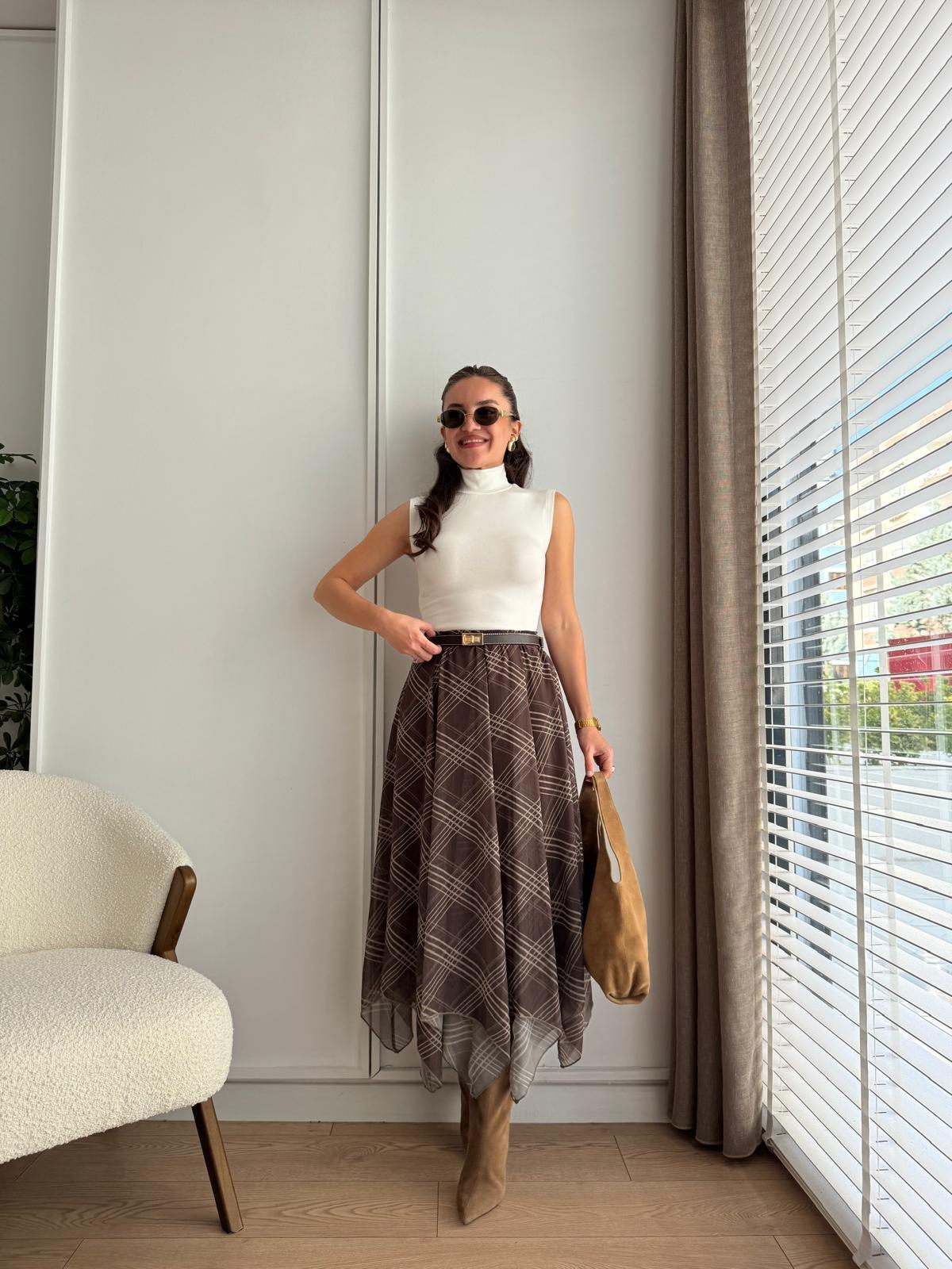 Haki Desenli Bel Lastikli Şifon Etek 251105