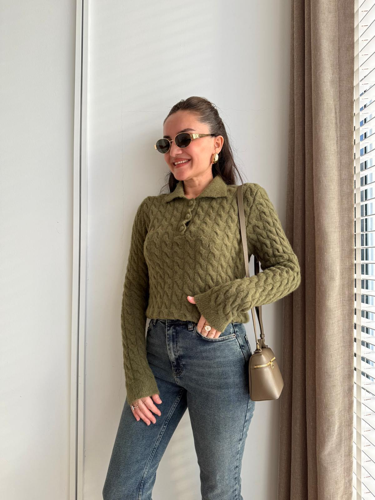 Haki Polo Yaka Saç Örgülü Triko Kazak 4984