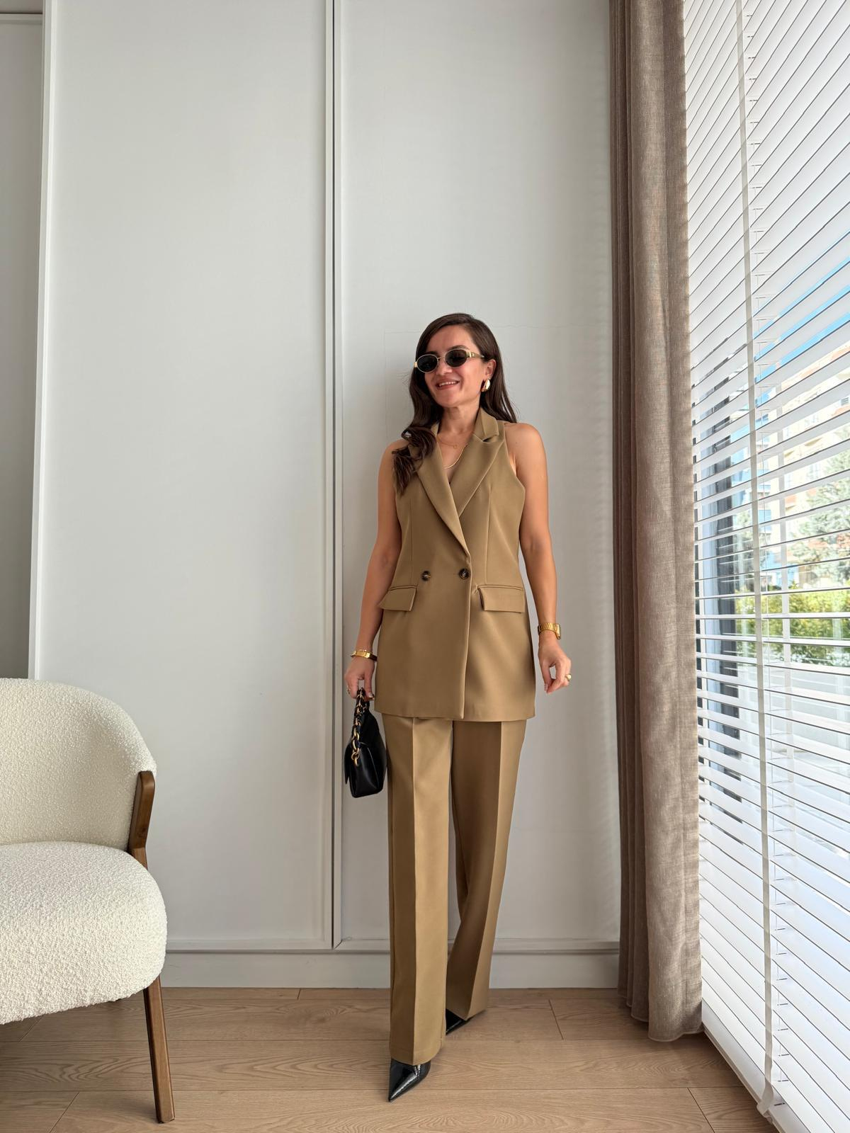 Haki Premıum Seri Kruvaze Yaka Düğmeli Yelek Pantolon Takım 8775