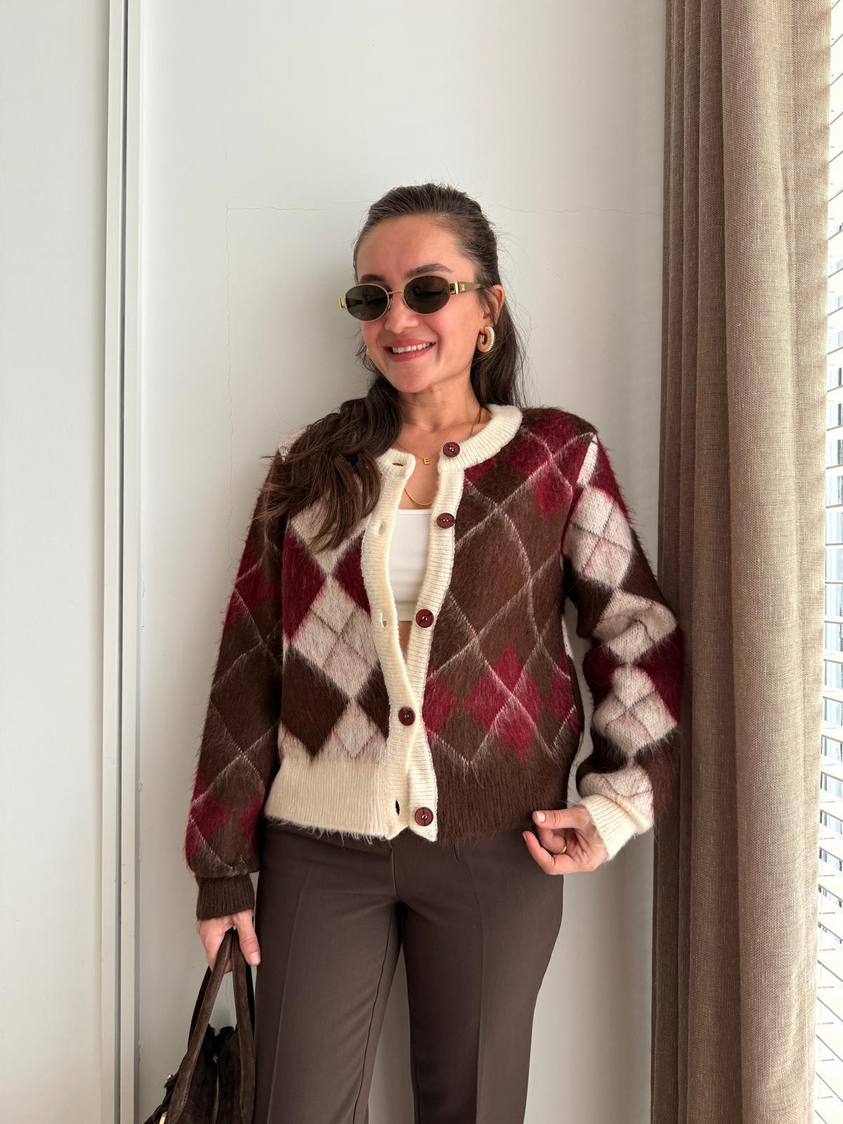 Kahve rengi Baklava Desenli Sakallı Triko Hırka 4922