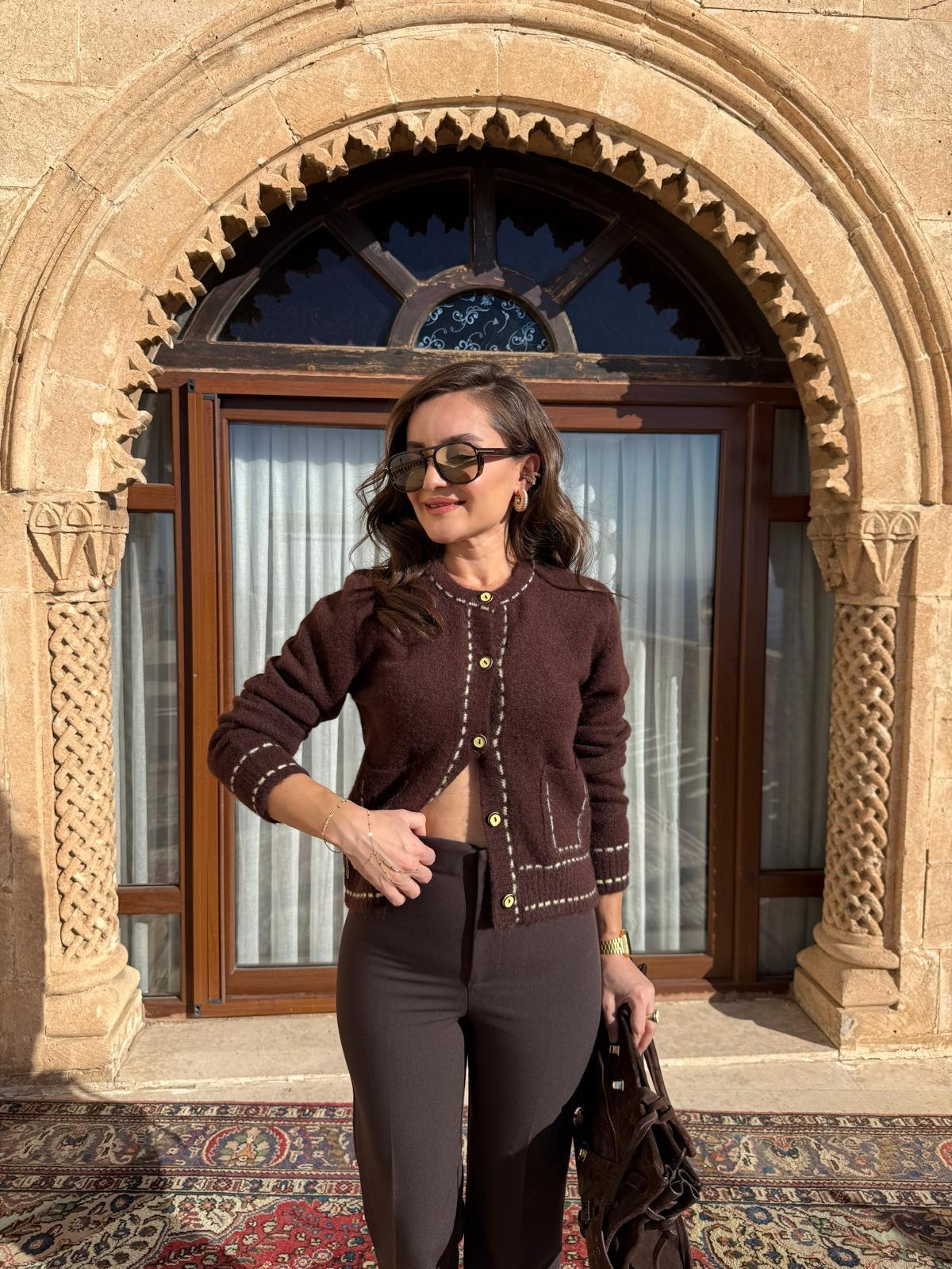 Kahve rengi Bisiklet Yaka Cepli Triko Hırka 4892