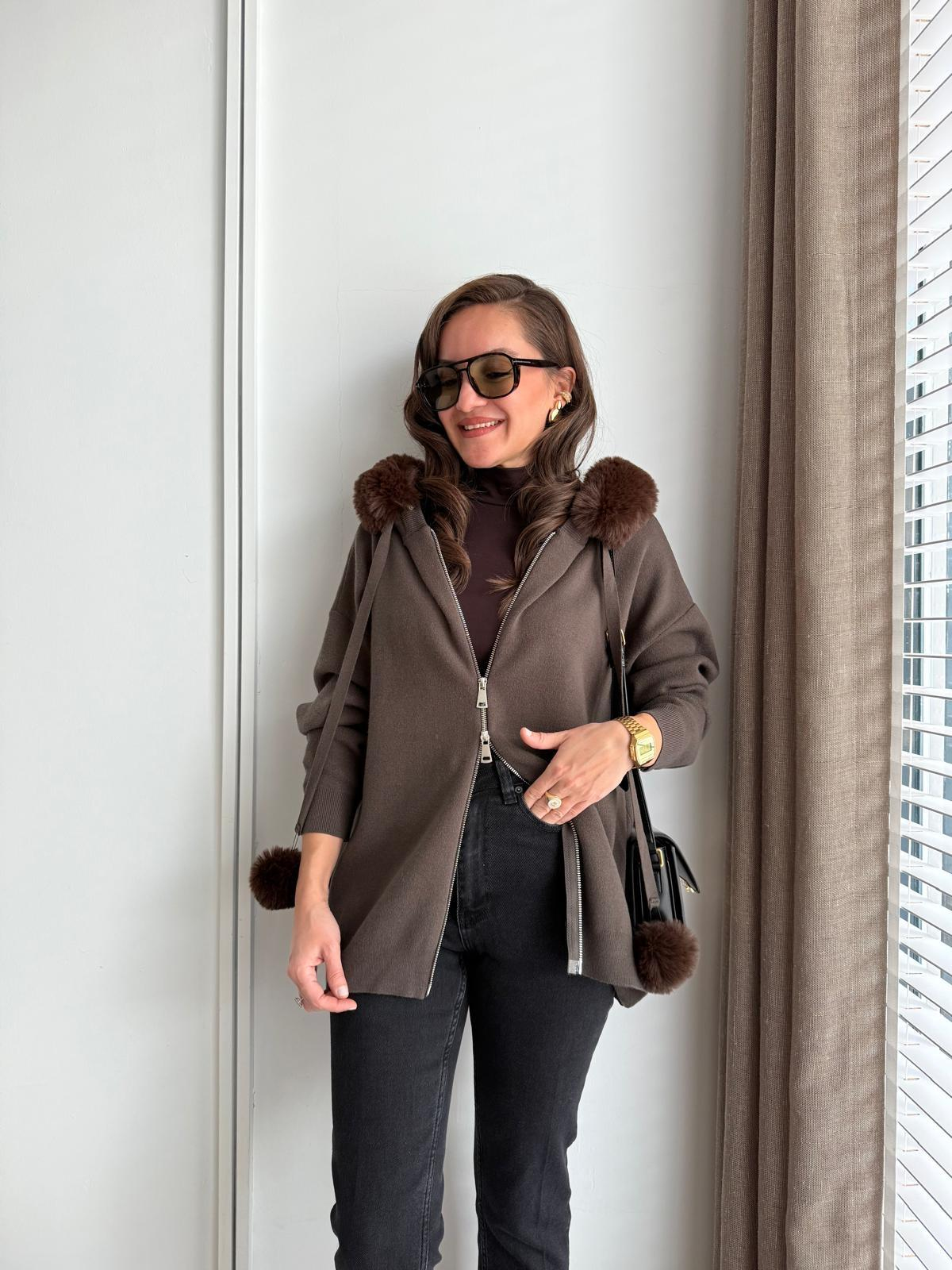Kahve rengi Kapüşonu Kürklü Ponponlu Triko Hırka 140215