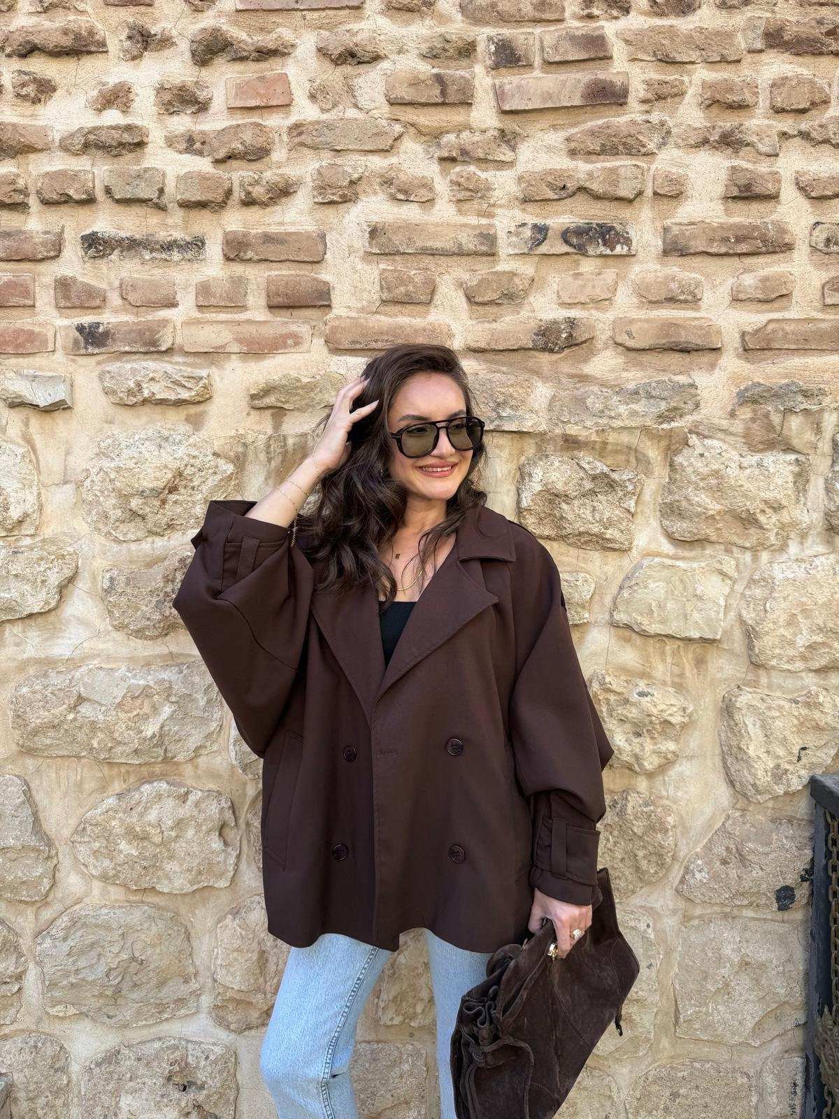 Kahve rengi Kruvaze Yaka Kol Detaylı Kısa Trençkot 7537
