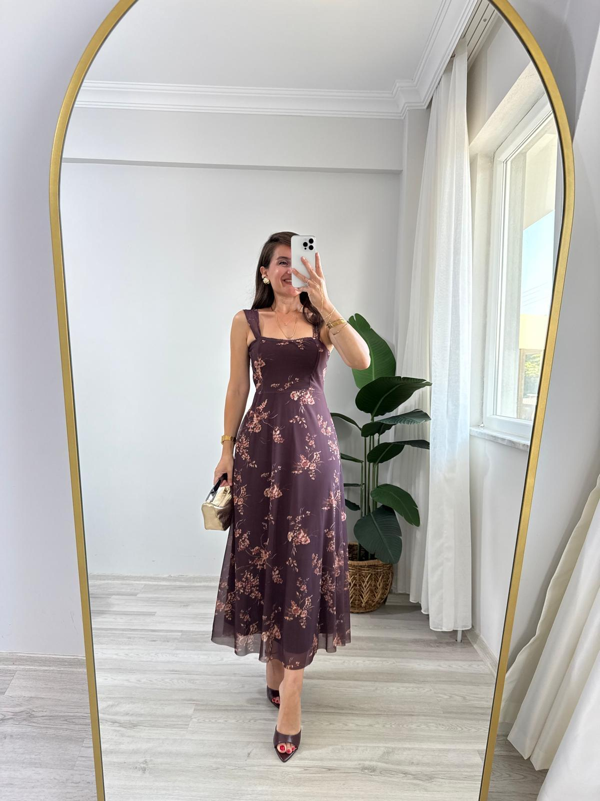 Kahve rengi Nakış Detaylı Çiçekli Tül Elbise 251096