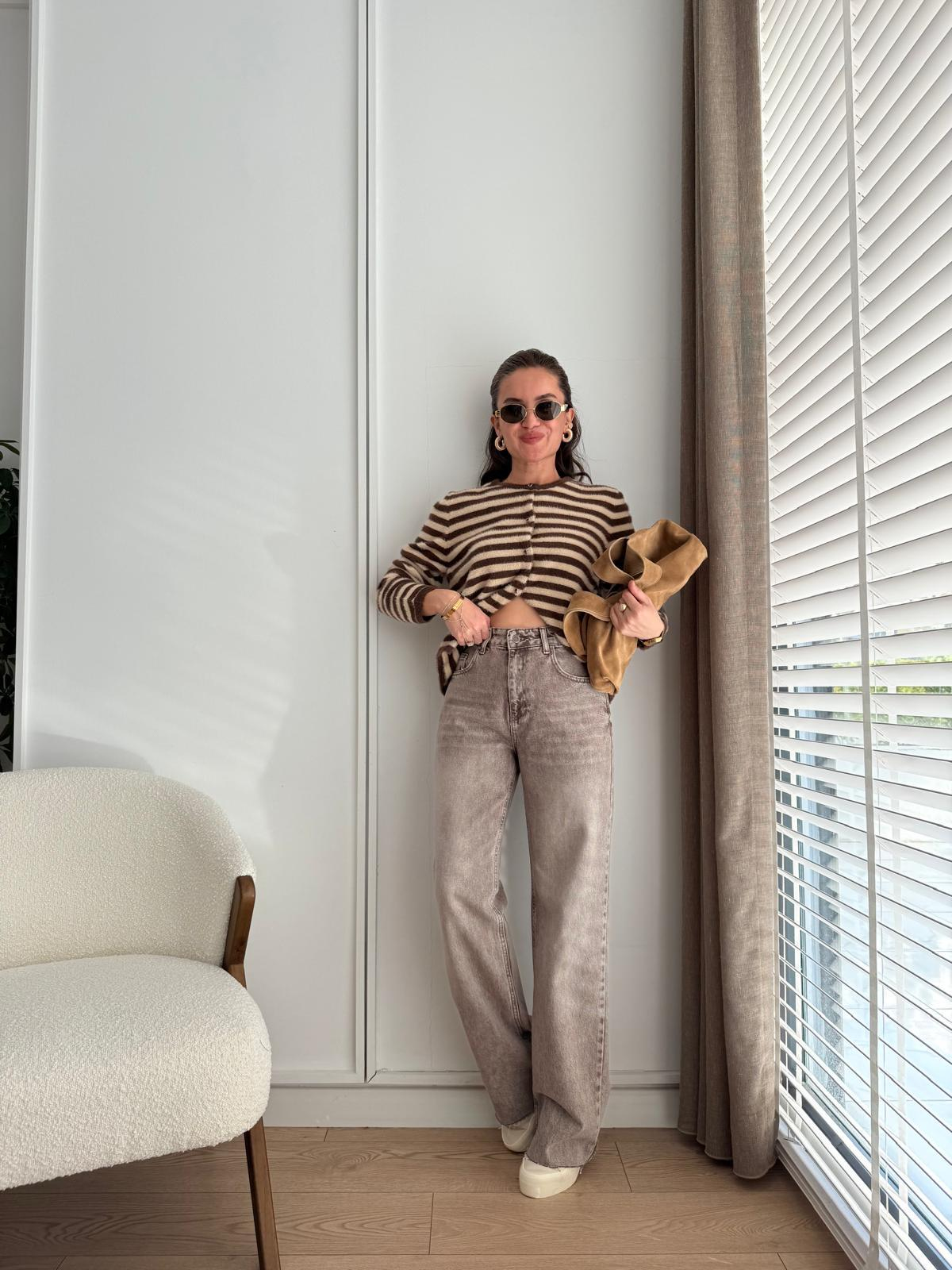 Kahve rengi Paçası Kesik Wide Leg Jean 1018