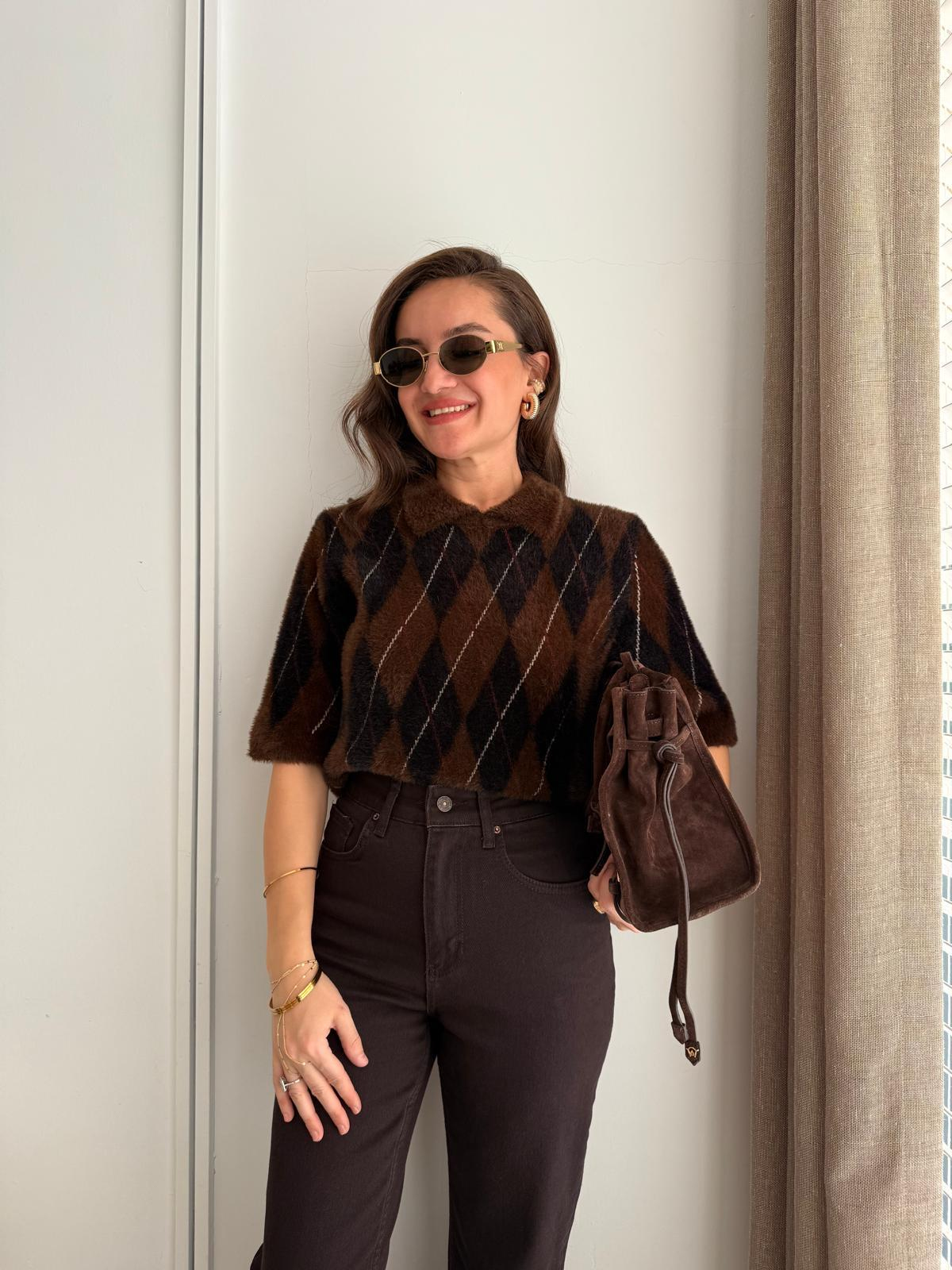 Kahve rengi Polo Yaka Baklava Desen Kısa Kol Kazak 7754