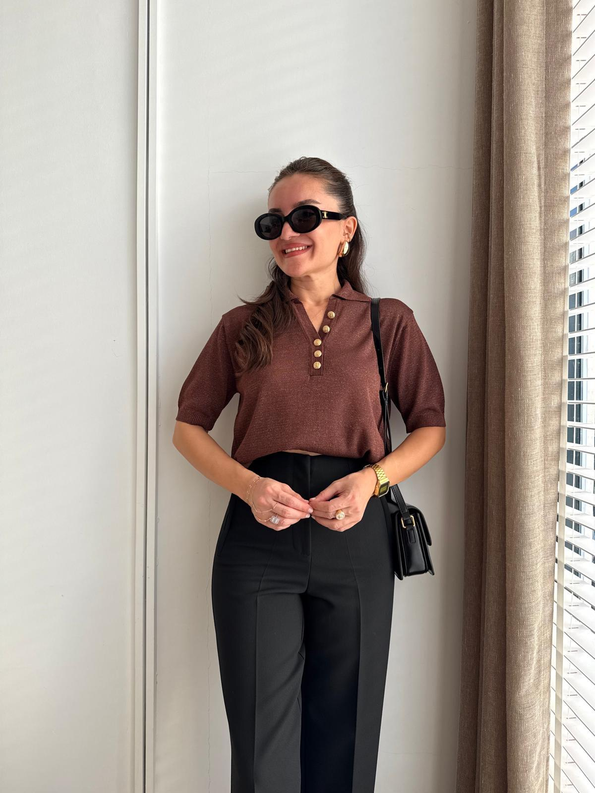 Kahve rengi Polo Yaka Gold Düğmeli Simli Bluz 251111