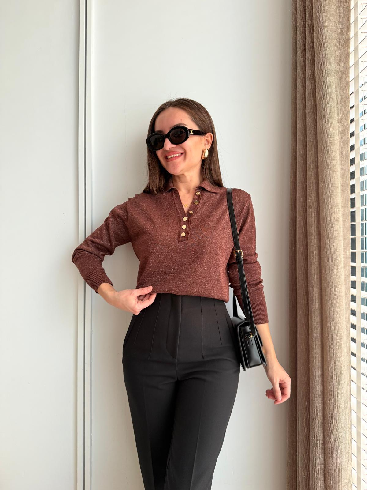 Kahve rengi Polo Yaka Gold Düğmeli Simli Triko Bluz 251133