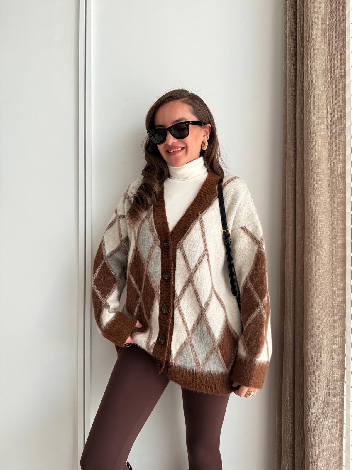 Kahve rengi V Yaka Baklava Desen Triko Hırka 60989