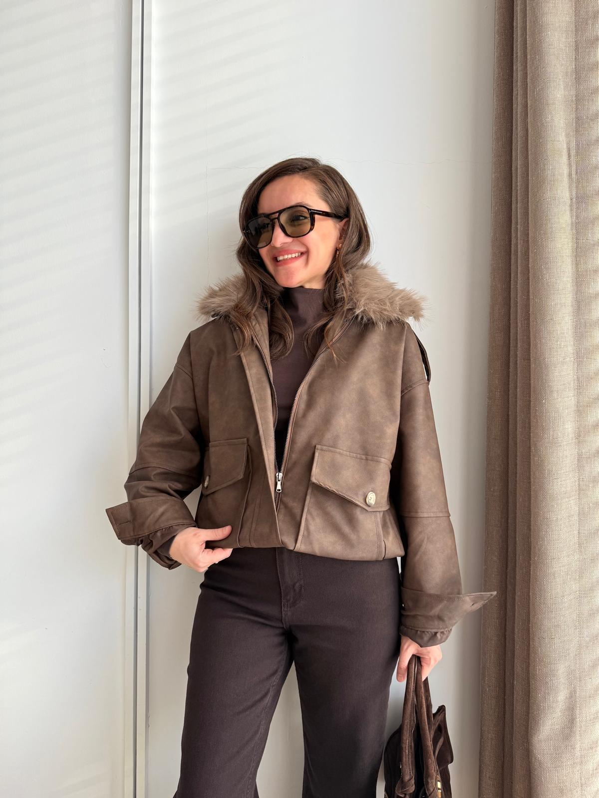Kahve rengi Yakası Kürklü Astarlı Deri Mont 36821