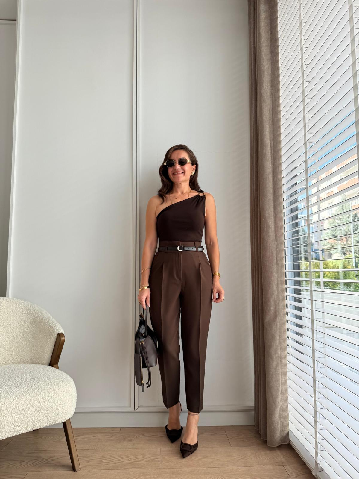 Kahve rengi Yüksek Bel Kemerli Pantolon 3790