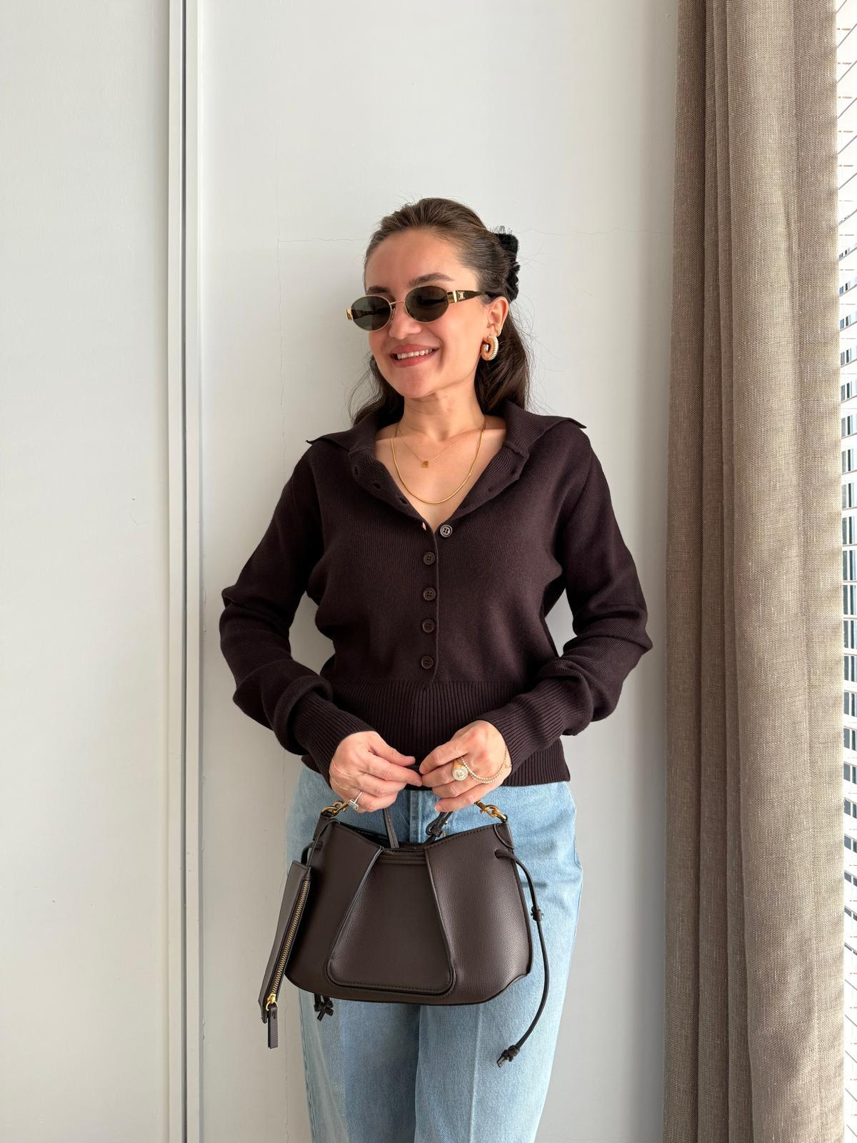 Koyu kahve Polo Yaka Düğmeli Triko Kazak 10816