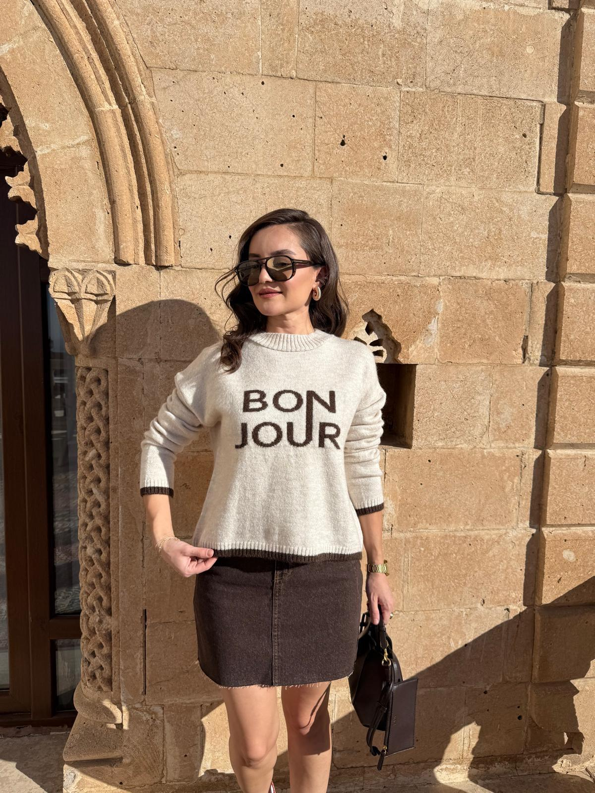 Krem Bisiklet Yaka Biyeli Yazı Detaylı Triko Kazak 0954