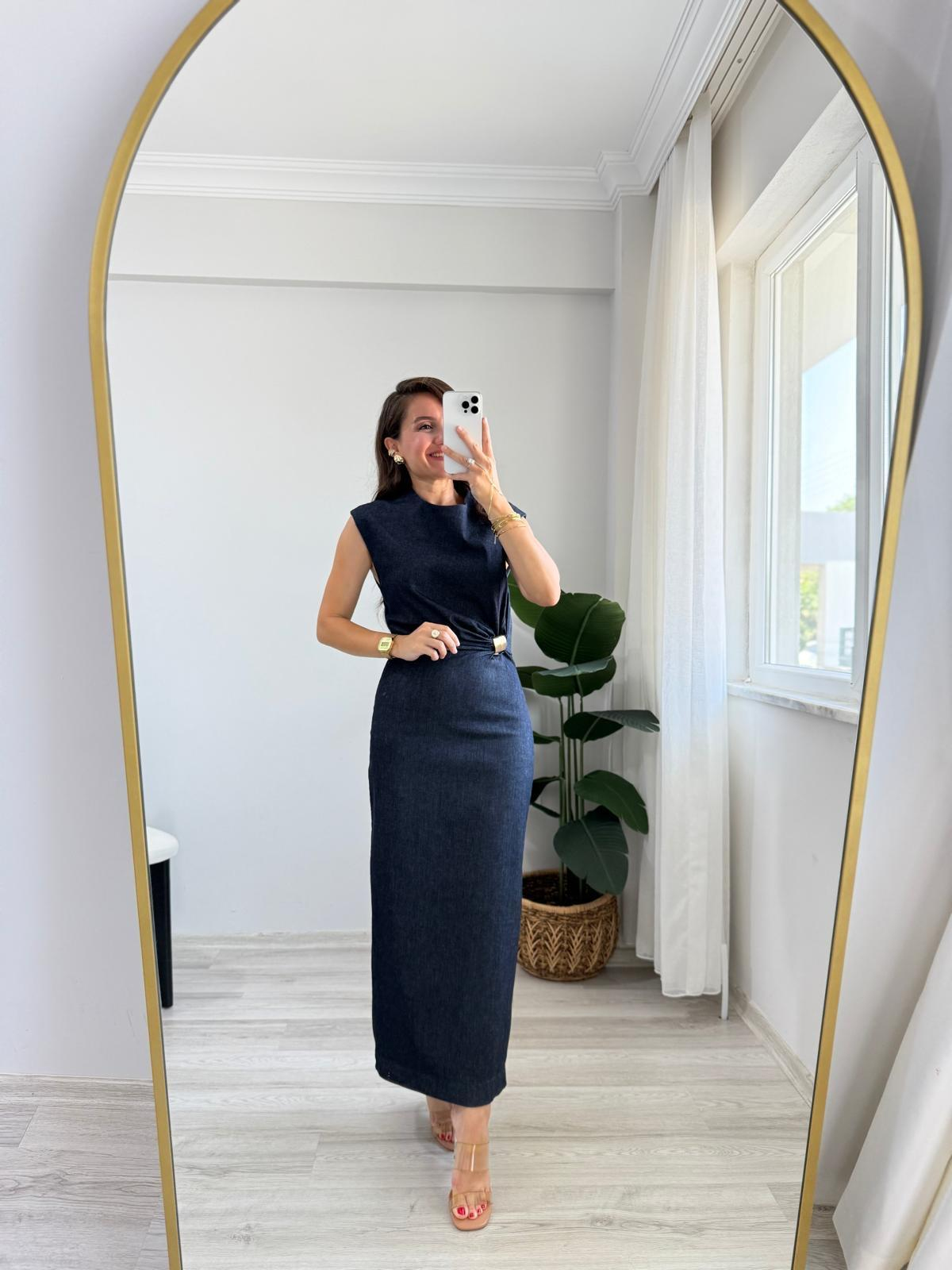 Lacivert Bel Toka Detaylı Denim Elbise 8192