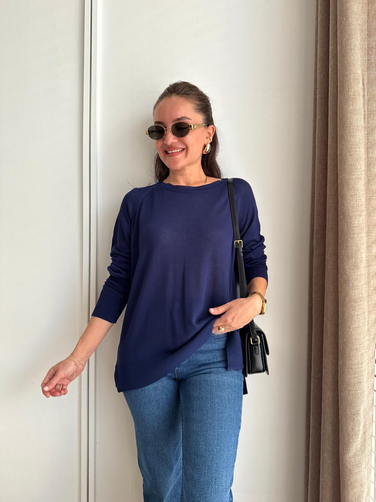 Lacivert Bisiklet Yaka Basic Triko Bluz 10299