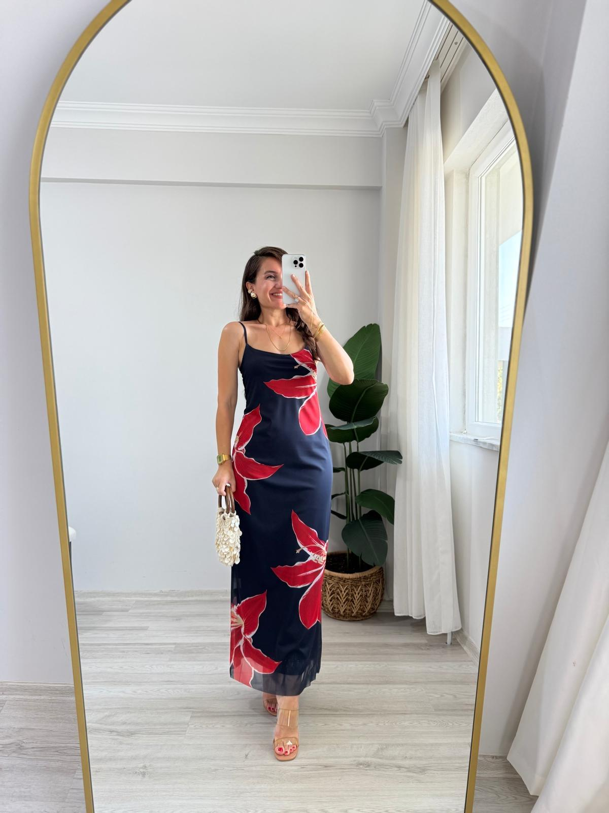 Lacivert Çiçek Desenli Askılı Tül Elbise 251084