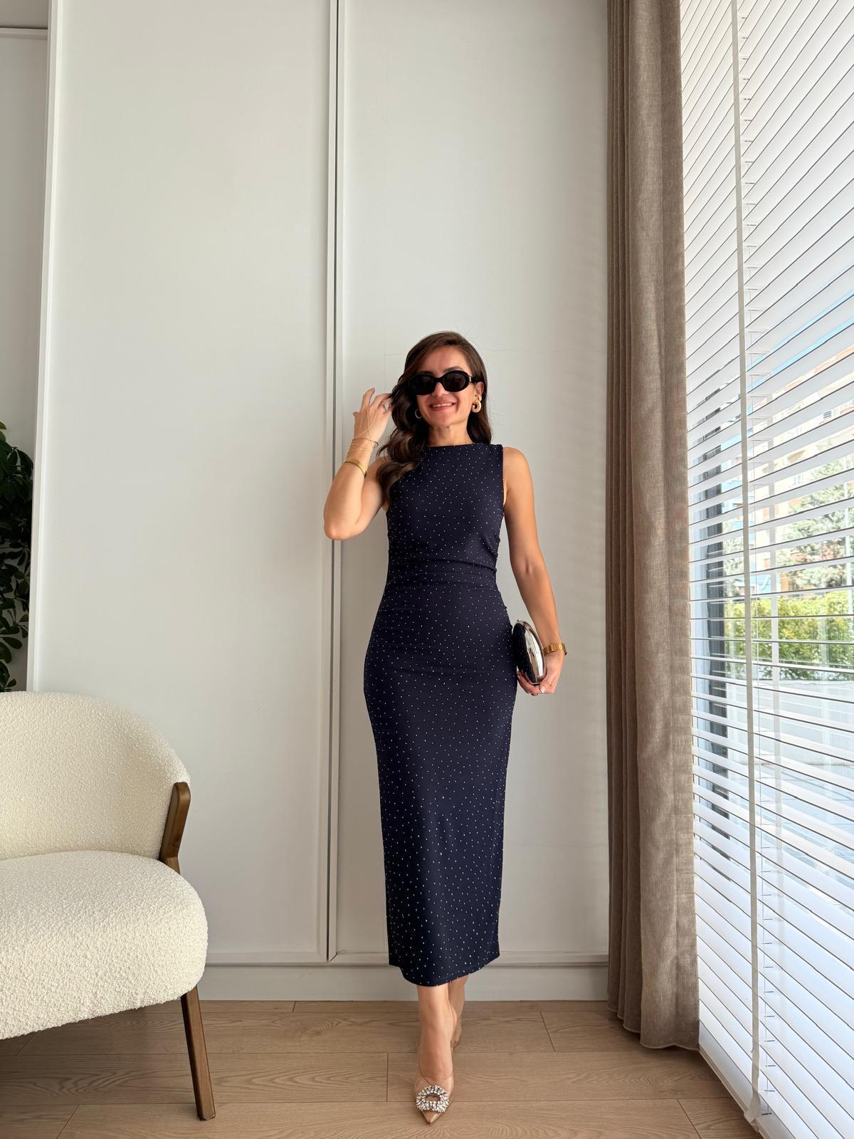 Lacivert Taşlı Yırtmaçlı Midi Boy Elbise 1314