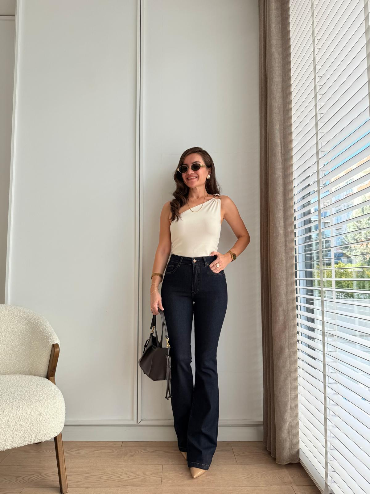 Lacivert Yüksel Bel Full Likralı İspanyol Paça Jean 0867