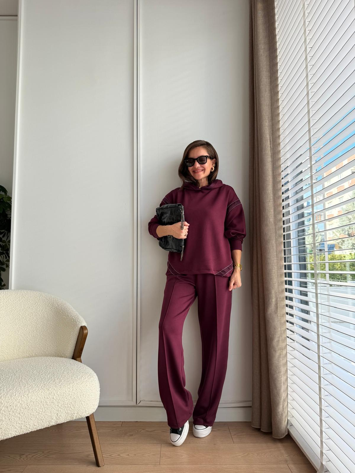 Mürdüm Kapüşonlu Taş Detaylı Modal Takım 2573