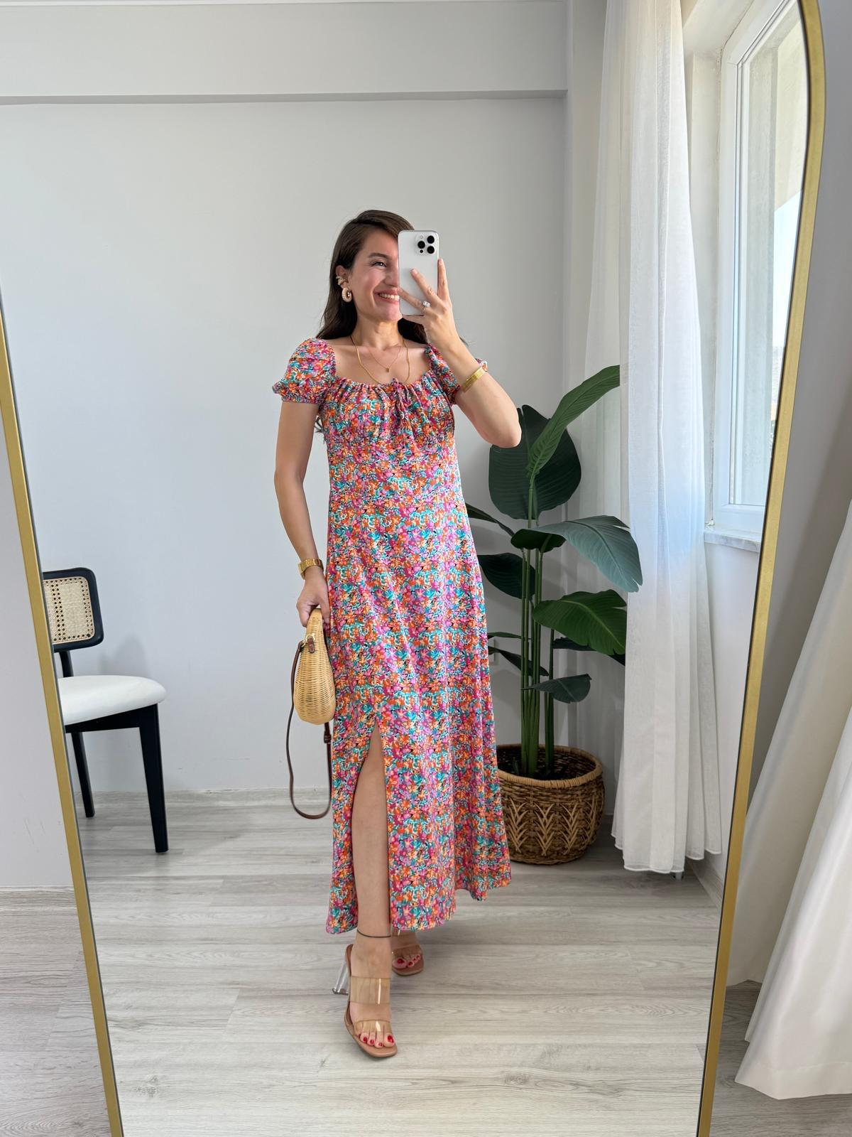 Pembe Desenli Yaka Bağcıklı Sırt Gipeli Elbise 5803
