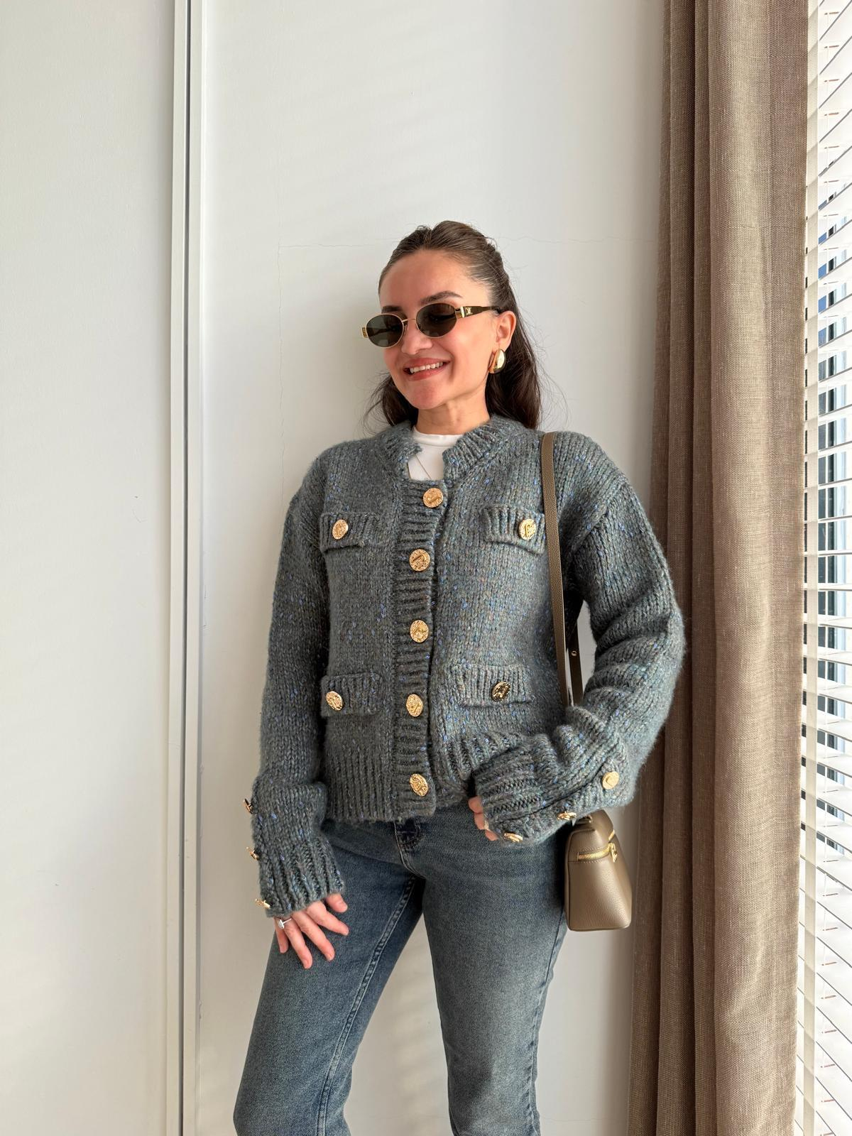Petrol yeşili Sim Geçişli Gold Düğmeli Örme Triko Hırka 3183