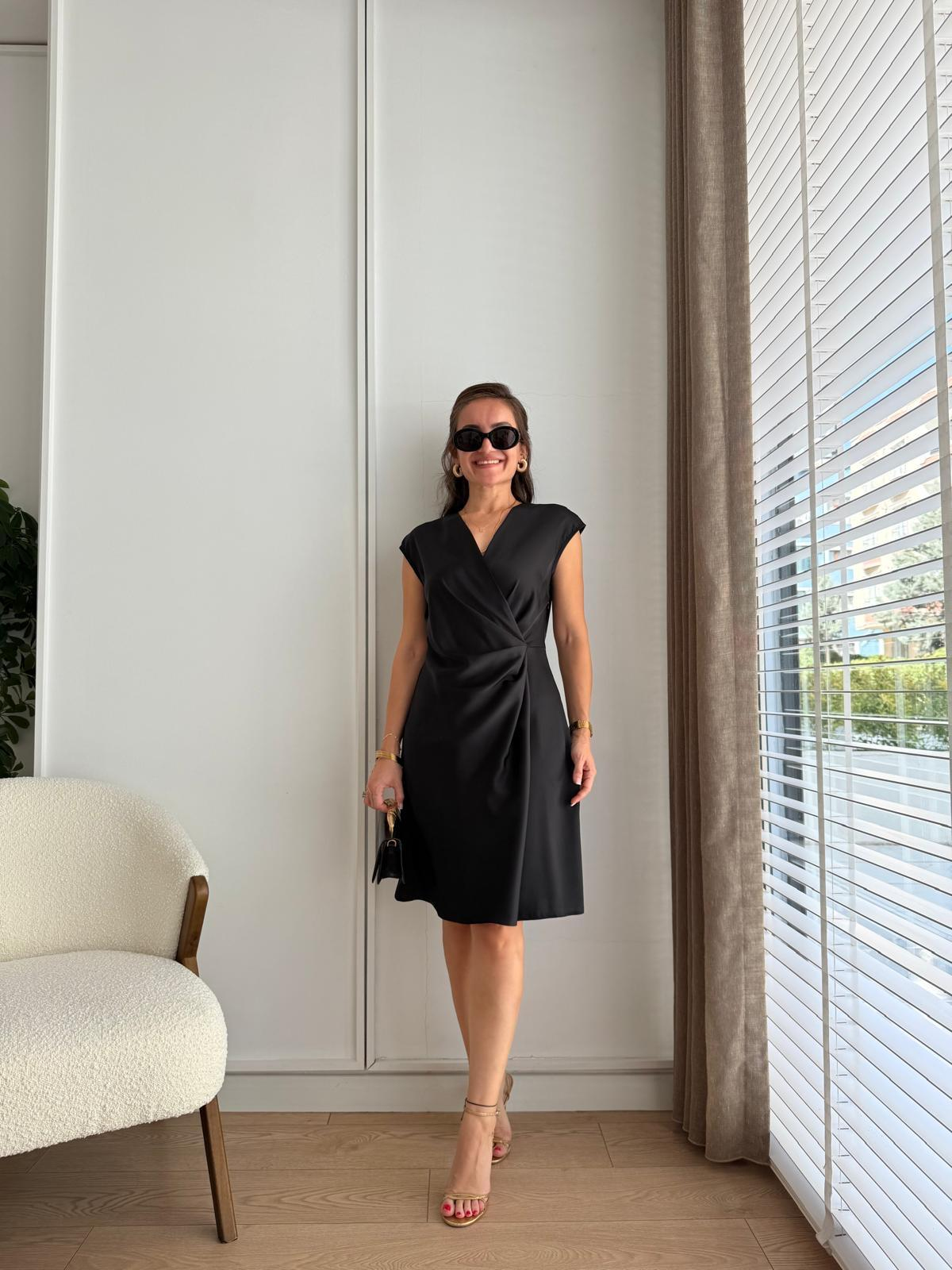 Siyah Bel Büzgü Detaylı Kruvaze Elbise 2480